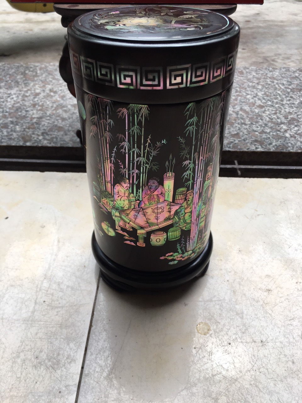 _ Hộ đựng trà được tiên khắc kết hợp với khảm ốc đỏ ,rất tỉ mỉ tinh sảo kỳ công ,Ốc đỏ là một loại ốc quý hiếm ,thường xuyên sinh sống ở những nước xa sôi như singgapo và nhật bản ,như ở việt nam biển rất nhiều lên không có ốc ,nếu có thì có rất ít lại không mầu ,Chính vì thế ốc thường được nhập khẩu từ singgapore về rất đắt đỏ ,những bù lại mầu sắc rất đỏ và đẹp ,và được rất nhiều người ưa chuộng cũng như muốn sử hữu 1 sẩn phẩm khảm ốc đỏ như khảm sập gụ tủ chè tranh ảnh ,đặt biệt khảm vào hộp đựng trà ,kết hợp với chất liệu thân gỗ trắc đỏ đen . Đã nâng tầm hộp trà chè với sự sang trọng được đánh giá cao .Hộp đựng trà chè được làm và hoàn thiện do bàn tay khối óc tài hoa từ những người thợ dầy rặn kinh nghiệm ,Cũng như tay nghề cao trong làng nghề truyền thống .Chính vì thế hộp đựng trà đã đáp ứng đầy đủ những tiêu trí ( Đẹp bền rẻ ) Thẩm mỹ nghệ thuật với chất lượng tuyệt vời