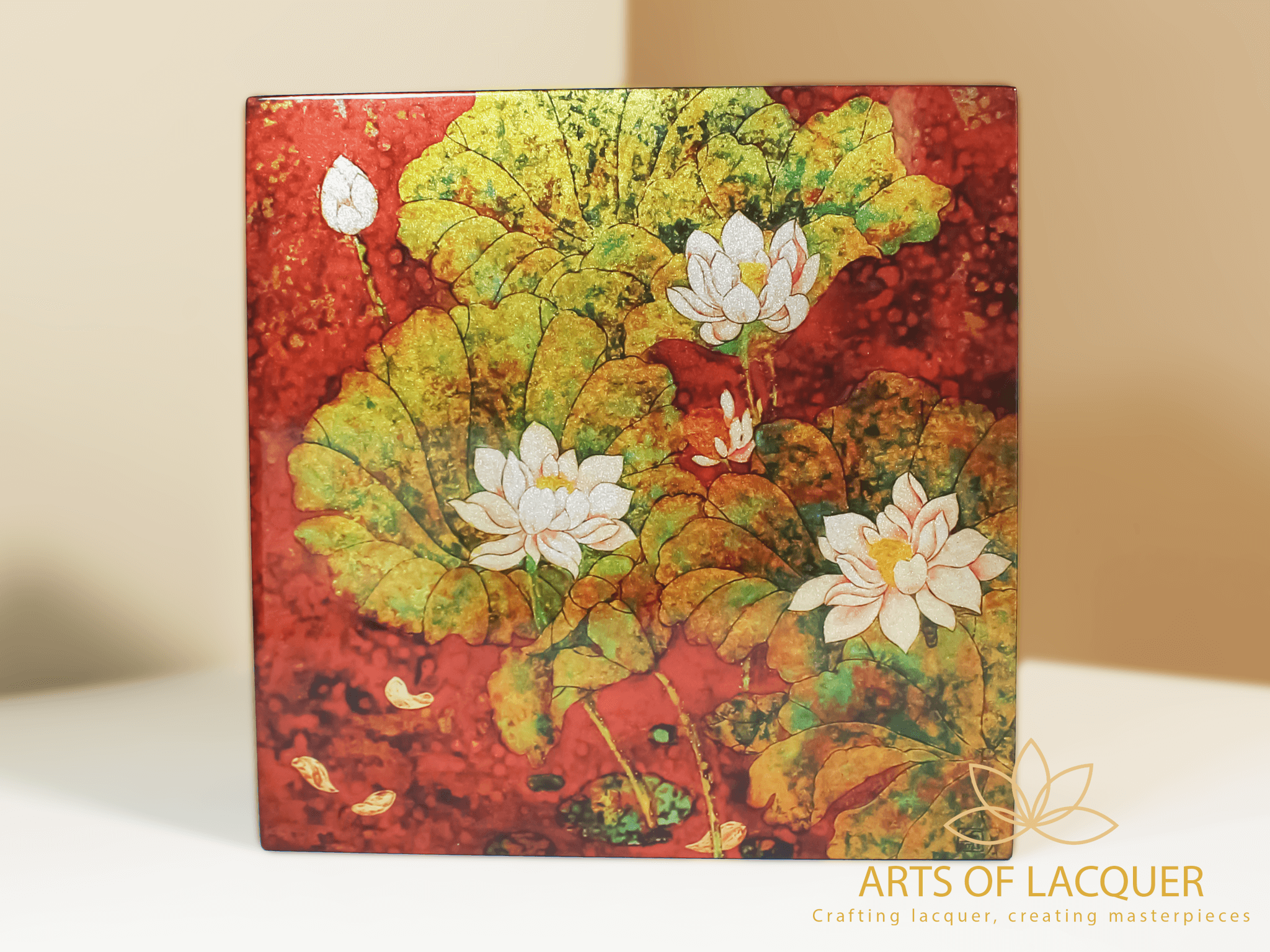 Sản phẩm trong hình là "Hộp Lưu Niệm Sơn Mài Họa Tiết Ao Hoa Sen" từ Arts of Lacquer. Hộp có thiết kế vuông với nền màu đỏ, được trang trí bằng hình ảnh hoa