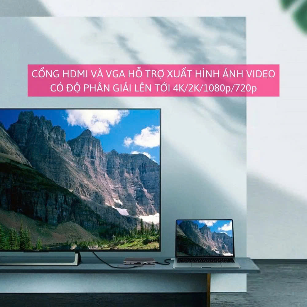 1. Tính năng: Hub mở rộng USB-C sang HDMI, VGA, USB, Lan, SD/TF, Sạc PD 2. Đầu vào: USB Type-C 3. Đầu ra: HDMI 4K@30Hz, USB-A x3, Sạc PD, VGA, LAN 4. Độ phân giải
