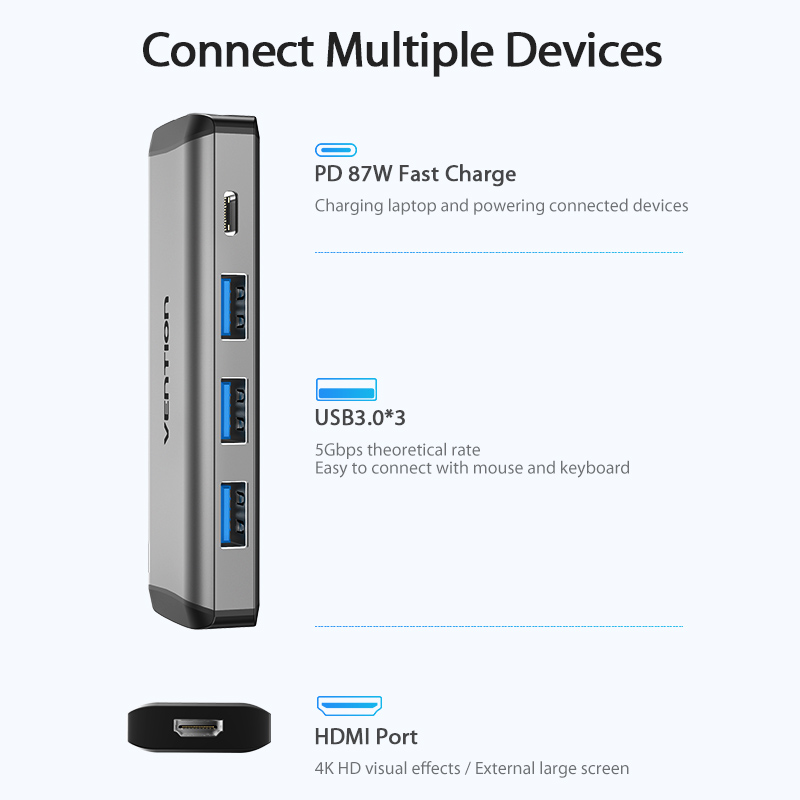 ✨HUB chuyển đổi USB Type-C 5 in 1 Vention - HDMI + USB 3.0*3 + PD ( 87W) - Hàng chính hãng