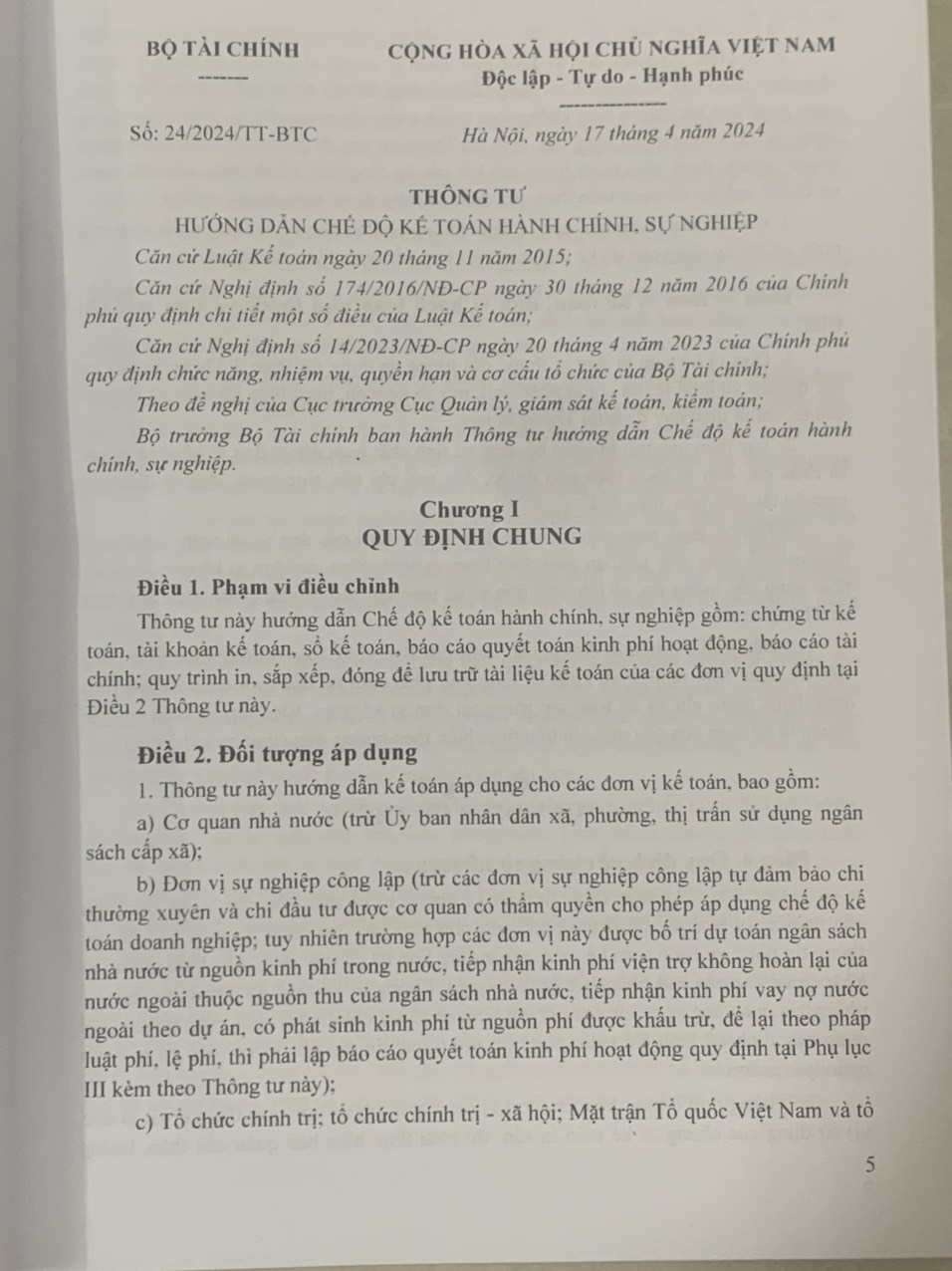 Ngày 17 tháng 4 năm 2024, Bộ Tài chính ban hành Thông tư số 24/2024/TT-BTC hướng dẫn Chế độ kế toán hành chính, sự nghiệp gồm: chứng từ kế toán, tài khoản kế toán, sổ kế toán, báo cáo quyết toán kinh phí hoạt động, báo cáo tài chính; quy trình in, sắp xếp, đóng để lưu trữ tài liệu kế toán của các đơn vị. Đối tượng được áp dụng cho các đơn vị kế toán, bao gồm: Cơ quan nhà nước (trừ Ủy ban nhân dân xã, phường, thị trấn sử dụng ngân sách cấp xã); Đơn vị sự nghiệp công lập; Tổ chức chính trị; tổ chức chính trị - xã hội; Mặt trận Tổ quốc Việt Nam và tổ chức, cơ quan, đơn vị khác là đơn vị sử dụng ngân sách nhà nước; Tổ chức, cơ quan, đơn vị thực hiện cơ chế tài chính của đơn vị sự nghiệp công lập.