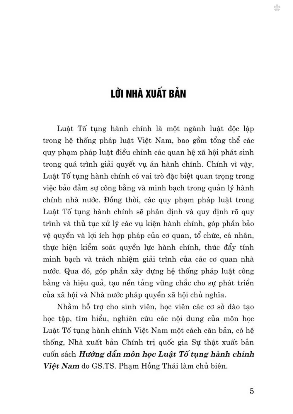 Mua tại TiktokNhằm hỗ trợ cho sinh viên, học viên các cơ sở đào tạo học tập, tìm hiểu, nghiên cứu các nội dung của môn học Luật Tố tụng hành chính Việt Nam một cách căn bản, có hệ thống, Nhà xuất bản Chính trị quốc gia Sự thật xuất bản cuốn sách Hướng dẫn môn học Luật Tố tụng hành chính Việt Nam do GS.TS Phạm Hồng Thái làm Chủ biên.