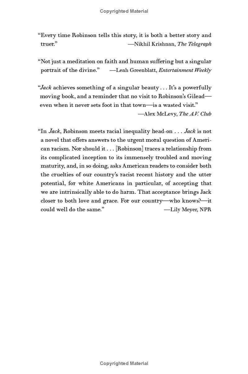 Jack is Robinson’s fourth novel in this now-classic series. In it, Robinson tells the story of John Ames Boughton, the prodigal son of Gilead’s Presbyterian minister, and his romance with Della Miles, a high school teacher who is also the child of a preacher. Their deeply felt, tormented, star-crossed interracial romance resonates with all the paradoxes of American life, then and now.