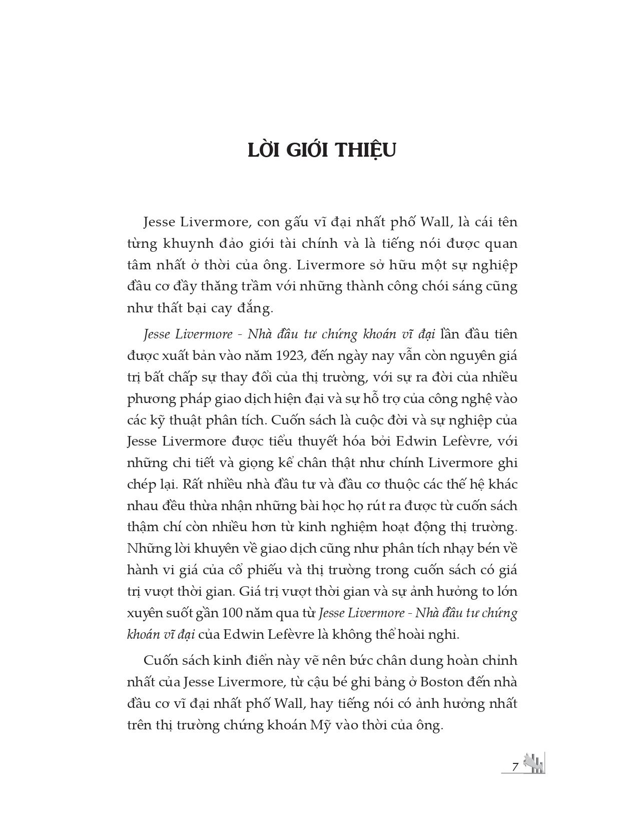 Cuốn sách “Jesse Livermore - Nhà đầu tư chứng khoán vĩ đại” lần đầu tiên được xuất bản vào năm 1923, đến ngày nay vẫn còn nguyên giá trị bất chấp sự thay đổi không ngừng của thị trường, với sự ra đời của nhiều phương pháp giao dịch hiện đại và sự hỗ trợ của công nghệ vào các kỹ thuật phân tích. Cuốn sách là cuộc đời và sự nghiệp của Jesse Livermore được tiểu thuyết hóa bởi Edwin Lefèvre, với những chi tiết và giọng kể chân thật như chính Livermore ghi chép lại. Rất nhiều nhà đầu tư và đầu cơ thuộc các thế hệ khác nhau đều thừa nhận những bài học họ rút ra được từ cuốn sách thậm chí còn nhiều hơn từ kinh nghiệm hoạt động thị trường.