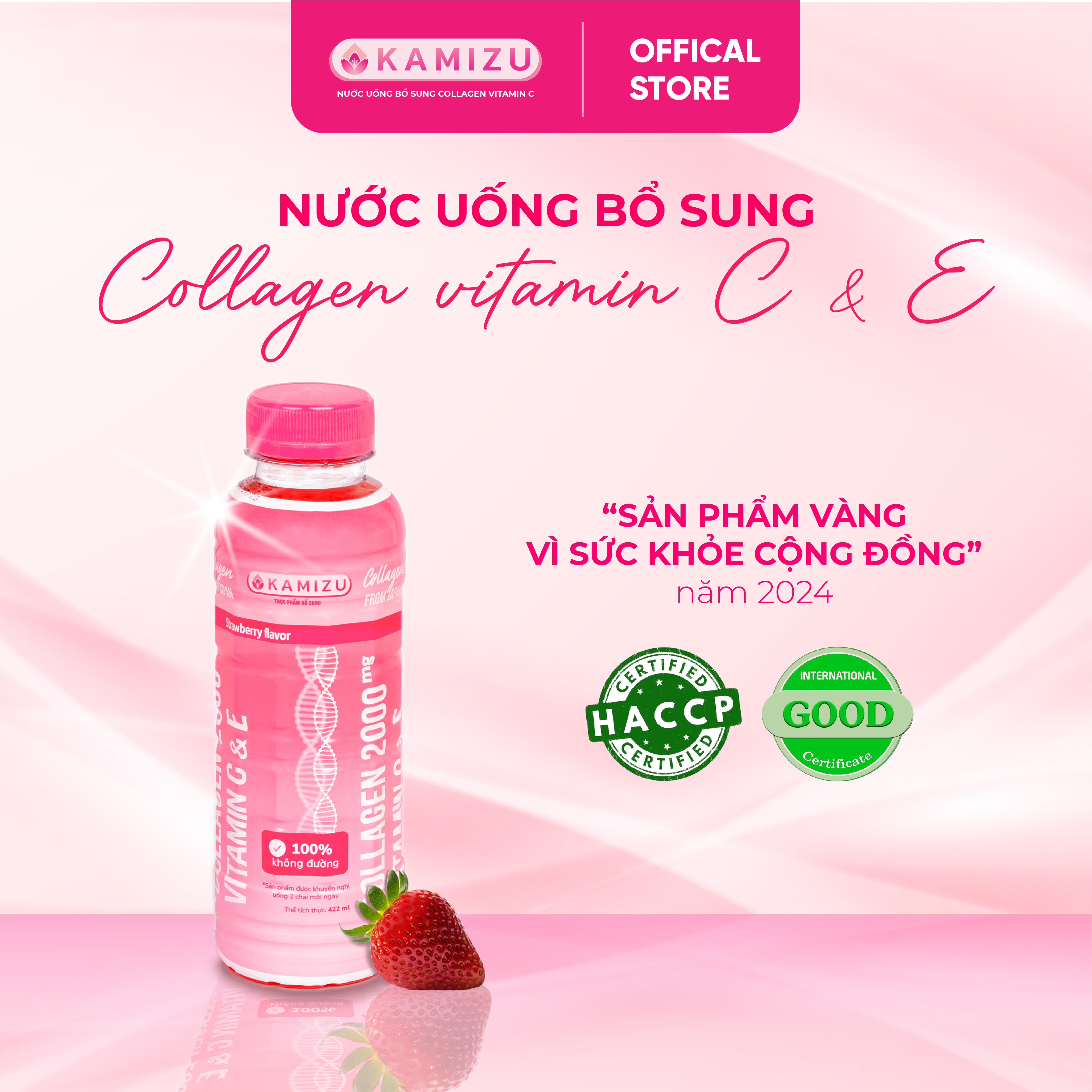 Nước uống bổ sung Kamizu Collagen Vitamin C & E Thành phần: Nước tinh khiết , Collagen fish, Vitamin C & E , hương liệu tổng hợp hương DÂU , chất tạo ngọt tổng hợp:
