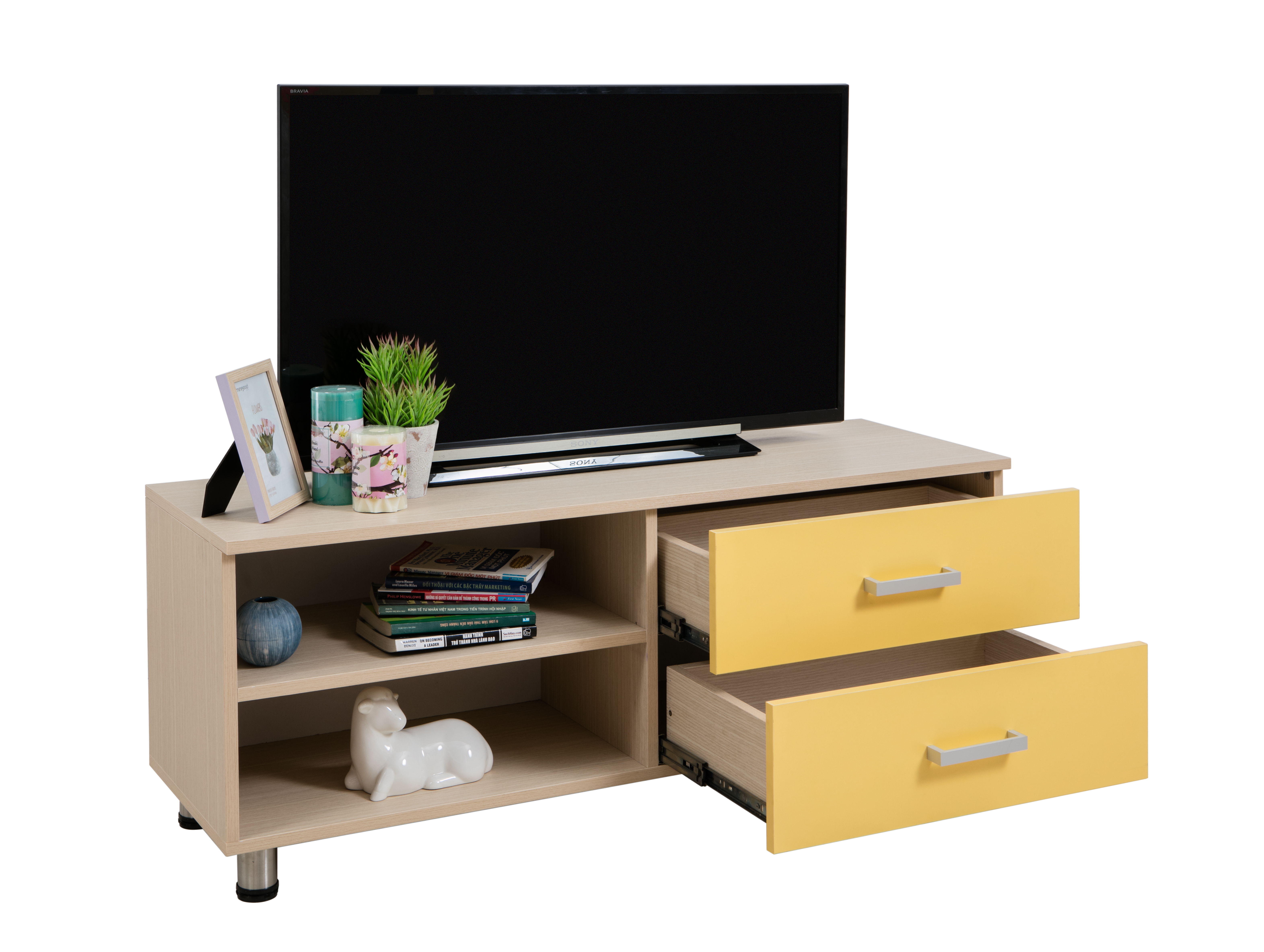 Mua tại TiktokKệ tivi để sản Sản phẩm đã được lắp sẵn thành 1 kiện Khung gỗ MFC phủ melamine màu vân gỗ , cánh tủ màu vàng DÀI 1200 X RỘNG 400 X CAO 500 (MM) KHÔNG BAO GỒM ĐỒ TRANG TRÍ , TIVI