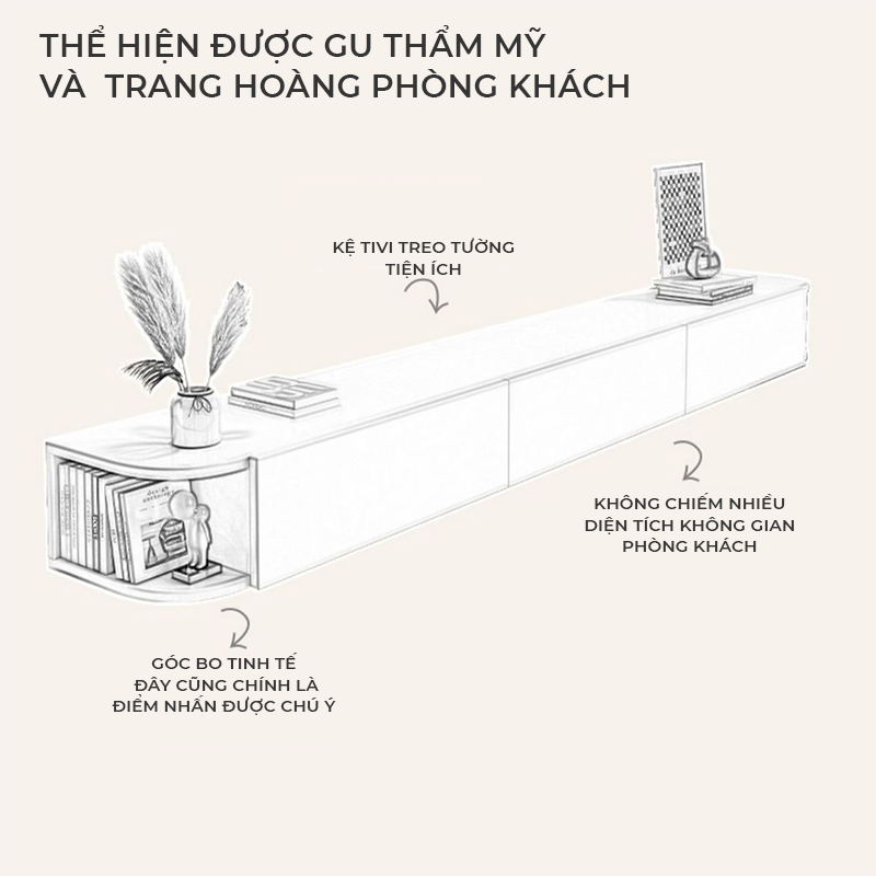 Công năng: Là mẫu kệ tivi có thiết kế hiện đại và đẹp mắt treo tường giúp không gian phòng rộng hơn.