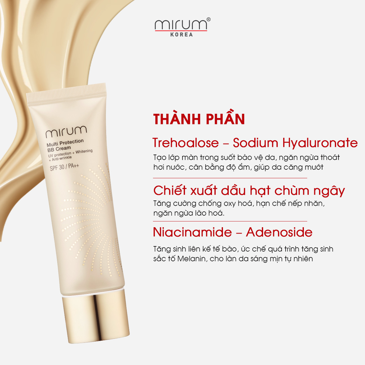 Kem BB 6in1 Mirum làm trắng da, chống lão hoá, dưỡng ẩm, chống tia UV, Lót và nền 50g Mirum Multi Protection BB cream SPF30/PA++ THÔNG TIN SẢN PHẨM Kem BB 6in1 Mirum làm trắng da, chống lão hoá, dưỡng ẩm, chống tia UV, Lót và nền - Thương hiệu: Mirum - Xuất xứ: Hàn Quốc - Dung tích: 50g - NSX: In trên bao bì sản phẩm - Hạn sử dụng: 3 năm (kể từ ngày sản xuất). - Khuyên dùng: Trong vòng 12 tháng (kể từ ngày mở nắp). LOẠI DA PHÙ HỢP: Mọi loại da THÀNH PHẦN CHÍNH: - Trehoalose – Sodium Hyaluronate: Tạo lớp màn trong suốt bảo vệ da, ngăn ngừa thoát hơi nước, cân bằng độ ẩm, giúp da căng mướt. - Chiết xuất dầu hạt chùm ngây: Tăng cường chống oxy hoá, hạn chế nếp nhăn, ngăn ngừa lão hoá. - Niacinamide – Adenoside: Tăng sinh liên kế tế bào, ức chế quá trình tăng sinh sắc tố Melanin,