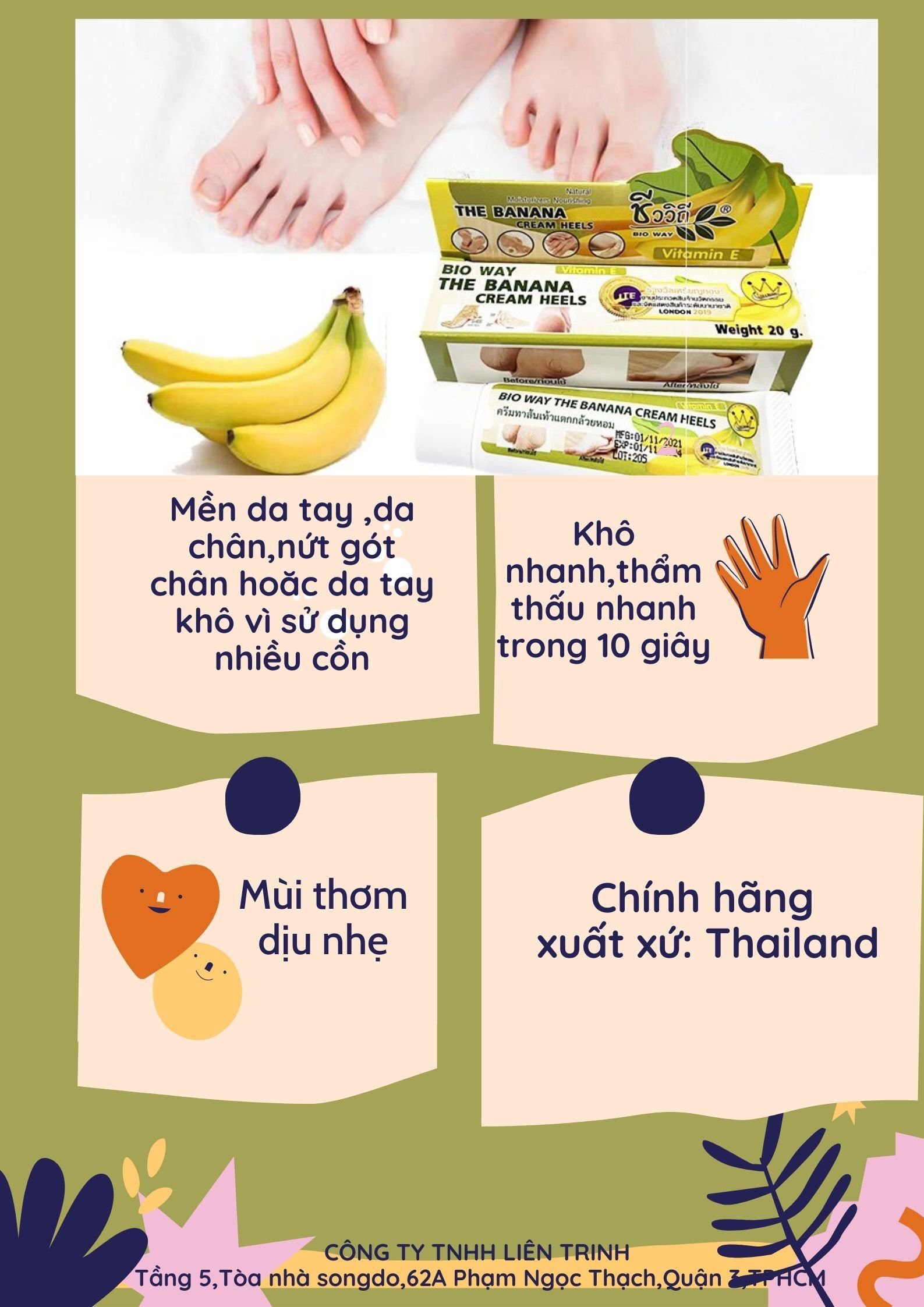 và gót chân BIO WAY THE BANANA CREAM HELLS 20g- Thailand Thành phần:      Water,carbomer,mineral oil Cetyl alcohol,ceteareth-20,stearyl alcohol              Triethanolamine,petrolatum,tocopheryl acetate Musa paradisiaca fruit extract,petrolatum, Methyl paraben Sản