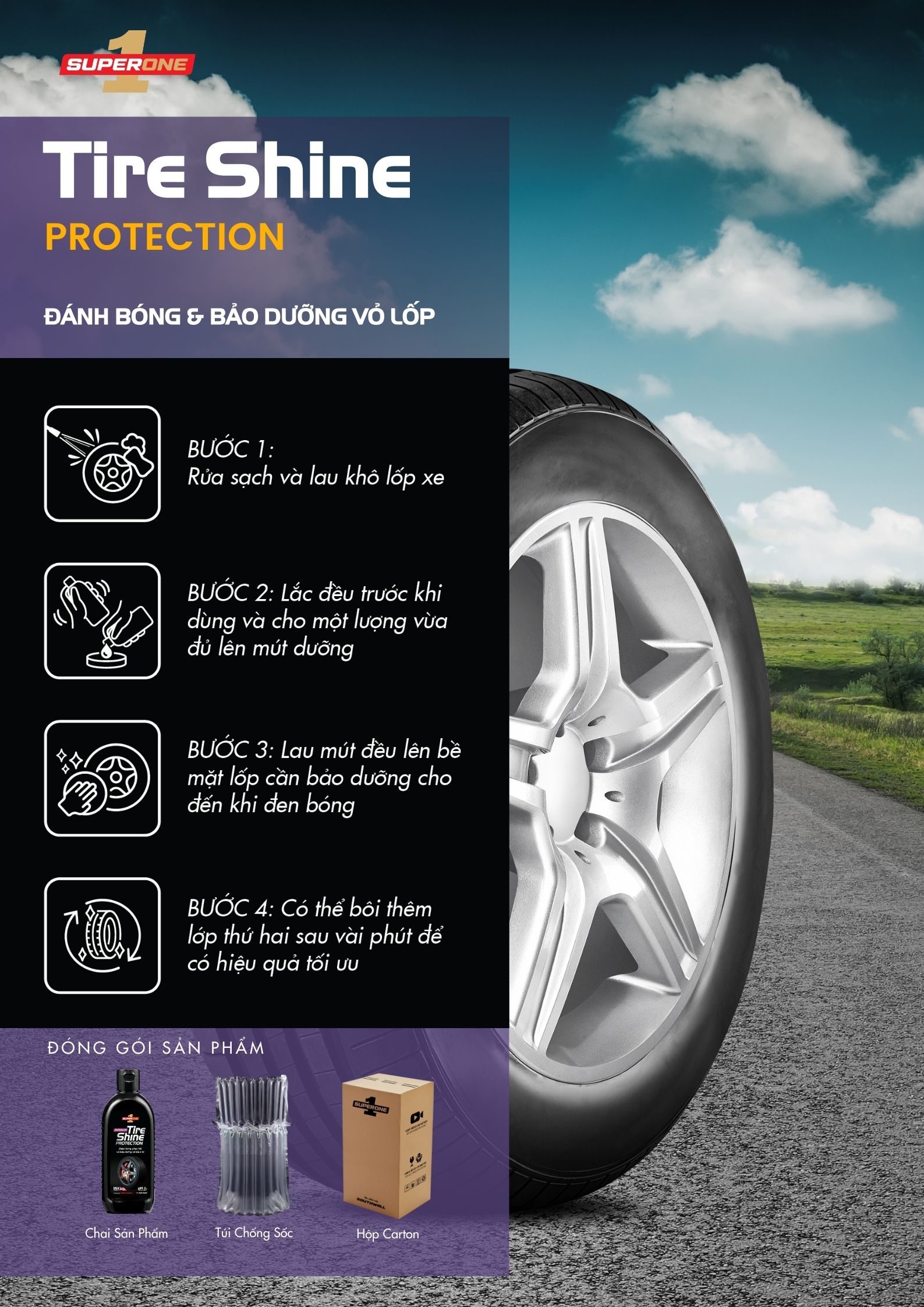 Kem Đánh Bóng Bảo Dưỡng Vỏ Lốp Ô Tô Super One Tire Shine Protection - Exterior là sản phẩm chăm sóc ô tô giúp làm mới, bảo vệ và giữ cho vỏ lốp ô tô luôn sáng bóng như mới. Với công thức tiên tiến, sản phẩm giúp tái tạo lại độ đen bóng như mới cho bề mặt vỏ lốp ô tô, ngăn ngừa sự lão hóa cao su do tác động của tia UV và nhiệt độ cao, bổ sung lớp phủ bảo dưỡng cho độ bóng tự nhiên, chống bám bẩn lốp xe, không làm ố hoặc tạo mảng bám trên bề mặt và có độ bền lớp dưỡng lâu dài. Sản phẩm chuyên dụng được khuyến cáo sử dụng cho các loại lốp ô tô. Kem Đánh Bóng Bảo Dưỡng Vỏ Lốp Ô Tô Super One Tire Shine Protection - Exterior là lựa chọn hoàn hảo để giúp chiếc xe của bạn luôn tỏa sáng, sang trọng và đẳng cấp.
