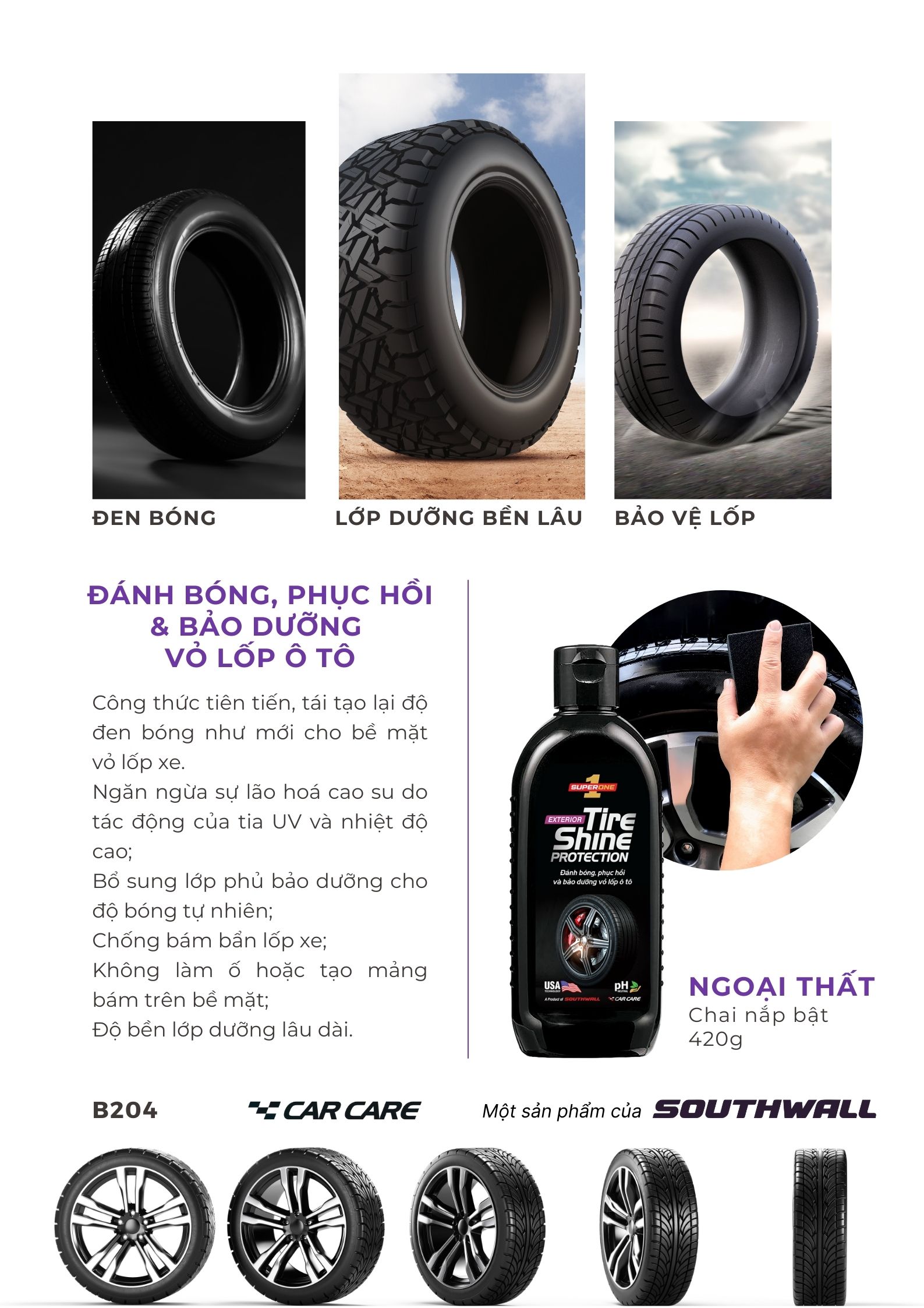 là sản phẩm chăm sóc xe hiệu quả. Do tác động của thời tiết hoặc chăm sóc xe không đúng cách. Hầu hết các lốp (vỏ) xe đều bị xuống màu sau một thời gian