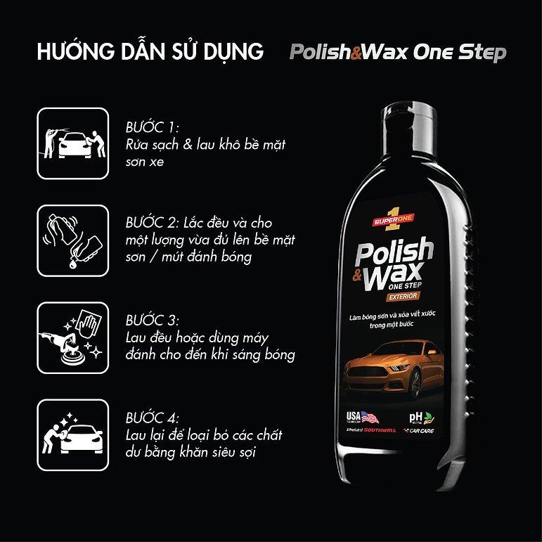 LÀM BÓNG SƠN VÀ XÓA VẾT XƯỚC TRONG MỘT BƯỚC   Kem Đánh Bóng Và Xóa Vết Xước Super One Polish & Wax One Step - Exterior là lựa chọn hoàn hảo để chăm sóc và làm mới bề mặt sơn xe của bạn chỉ trong một bước đơn giản. Với khả năng làm sáng bóng và xóa vết xước tinh và đốm ố nhẹ chỉ trong một bước, sản phẩm này đảm bảo sự dễ dàng và hiệu quả cho việc bảo quản độ bóng và sâu sắc của màu sơn. Sản phẩm an toàn cho tất cả các màu sơn bóng và có khả năng duy trì hiệu quả lâu dài. Bạn có thể sử dụng sản phẩm này dễ dàng bằng tay hoặc với máy đánh bóng.   Đặc Tính Sản Phẩm