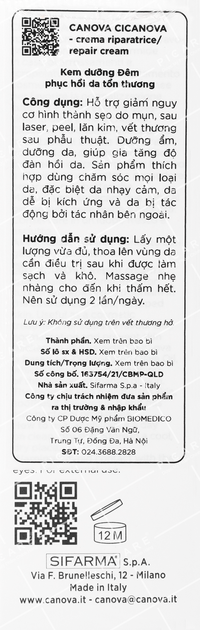 - Massage nhẹ nhàng cho đến khi thấm hết. Dung tích: 50ml Xuất xứ thương hiệu: Ý Sản xuất: Ý Nhập khẩu: Cty CP Dược Mỹ Phẩm BIOMEDICO Việt Nam Chịu trách nhiệm ra thị trường: Cty CP Dược Mỹ Phẩm BIOMEDICO Việt Nam Nhà phân phối chính hãng: Cty Picare Việt Nam. *** Mẫu mã bao bì có thể thay đổi theo từng lô nhập hàng của hãng.