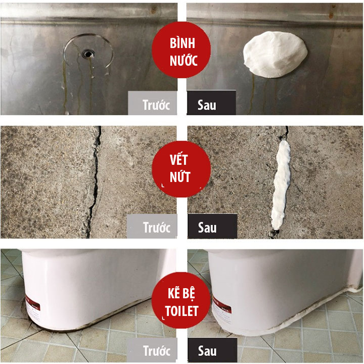 - Công dụng đa năng xử lý rò rỉ cho nhiều loại chất liệu ống nước, vá và chấm thấm cho những kẽ hở trên bề mặt So sánh Kết quả trước và sau khi vá bình nước, xử lý vết nứt khi dùng keo đất sét DOCONU