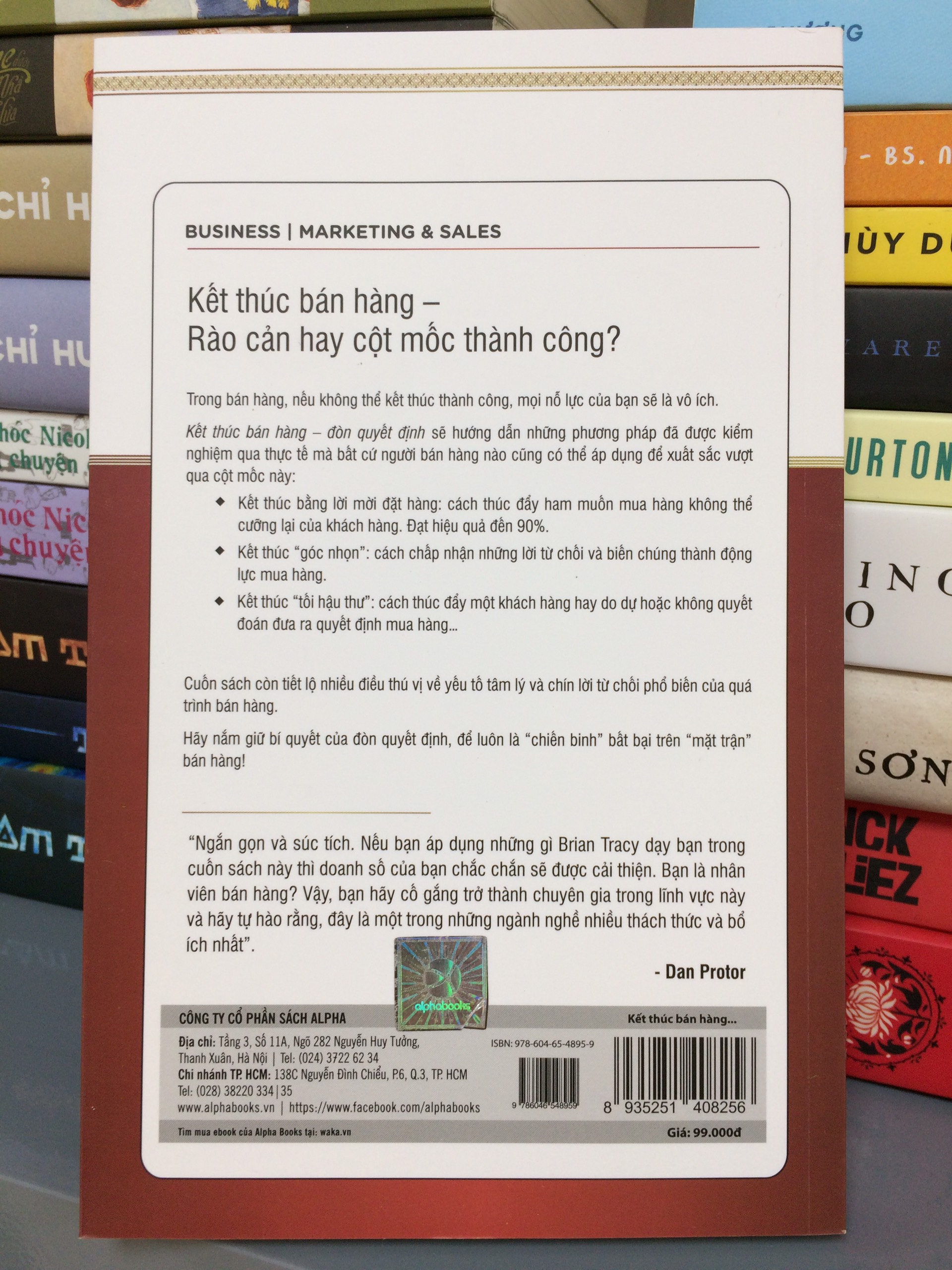 Mua tại TiktokMÔ TẢ SẢN PHẨM Kết Thúc Bán Hàng – Đòn Quyết Định (Tái Bản 2018) Cuốn sách này mô tả được nỗi lo sợ của tất cả những người bán hàng ở mọi cấp độ và mọi thang bậc kinh nghiệm – đó là khi phải đối mặt với thời điểm quyết định. Những người nhiều kinh nghiệm hơn cảm thấy dễ dàng hơn và vượt qua các cung bậc cảm xúc nhanh hơn những người mới. Sự khác biệt là ở chỗ tập luyện liên tục và chuẩn bị kỹ lưỡng, thực hành nhiều và vượt qua nỗi sợ hãi. Trong bán hàng, nếu không kết thúc thành công, mọi nỗ lực của bạn sẽ là vô ích. Kết thúc bán hàng – đòn quyết định sẽ hướng dẫn những phương pháp đã được kiểm nghiệm qua thực tế mà bất cứ người bán hàng nào cũng có thể áp dụng để xuất sắc vượt qua cột mốc này: