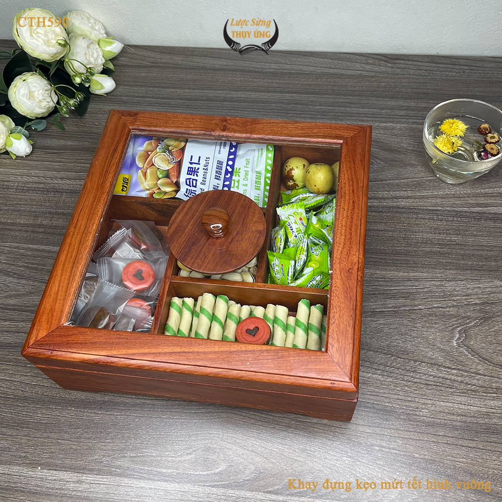 ✨Khay Bánh Kẹo Mứt Tết Gỗ Hương Nắp Kính Vuông Trong Suốt Thiết Kế Trang Trọng - CTH590