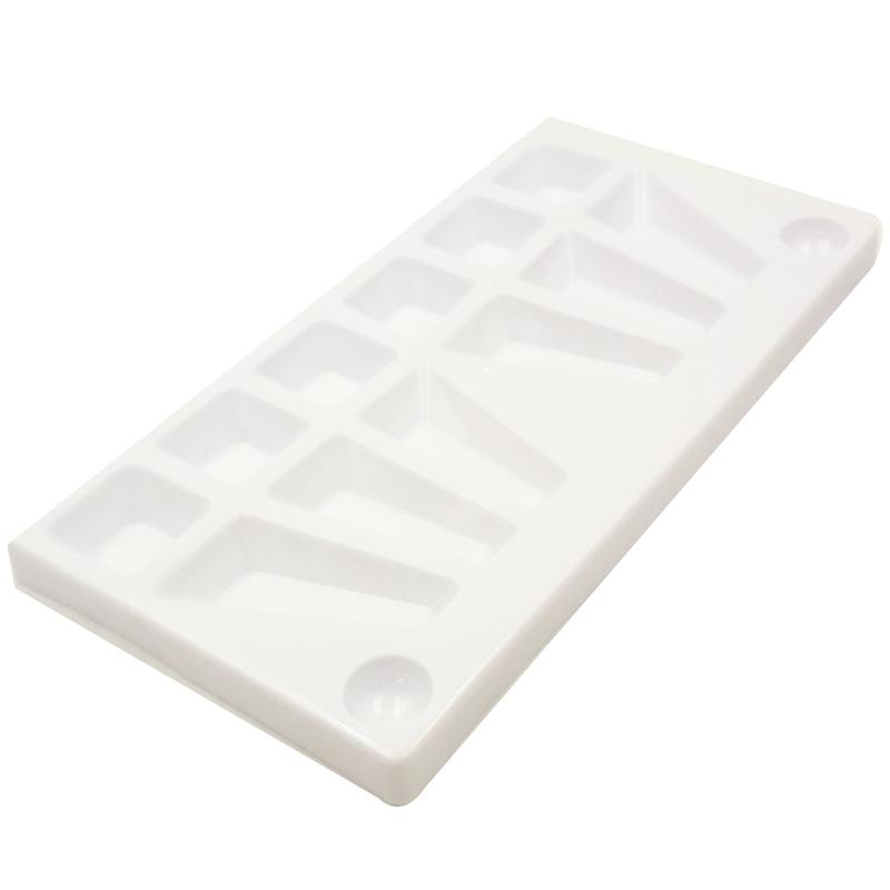 Có 12 khay màu gồm 6 khay nhỏ hình vuông và 6 khay dài hơn hình thang để pha trộn màu giúp tạo ra các tông màu khác nhau.
