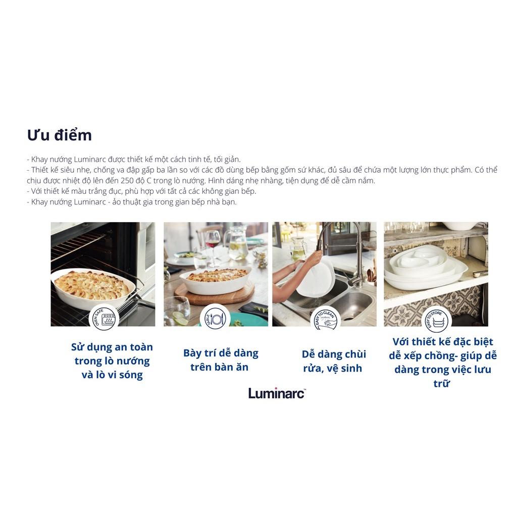 - Các sản phẩm khay nướng của Luminarc đã được kiểm tra vệ sinh an toàn thực phẩm theo quy định của Bộ Y Tế và cam kết 100% không chì, không chất độc hại. Khay nướng Luminarc được thiết kế một cách tinh tế, tối giản, siêu nhẹ, chống va đập gấp ba lần so với các đồ dùng bếp bằng gốm sứ khác, đủ sâu để chứa một lượng lớn thực phẩm. Hình dáng nhẹ nhàng, tiện dụng để dễ cầm nắm. Màu trắng sữa, phù hợp với tất cả các không gian bếp mà còn tôn nên sự sang trọng.