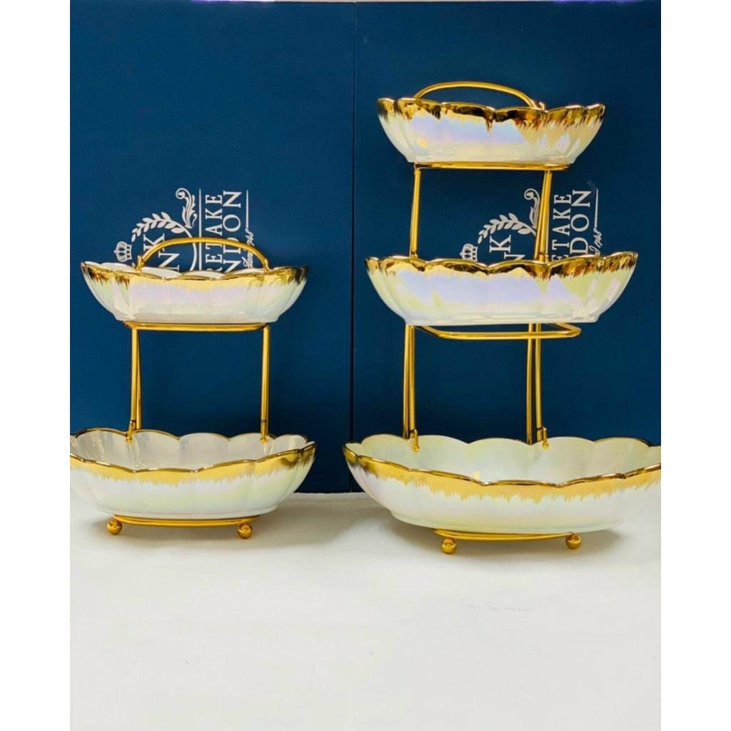 ✨KHAY SỨ ĐỰNG BÁNH KẸO HOA QUẢ KHUNG KIM LOẠI MẠ VÀNG CAO CẤP VÂN BÈO 2 TẦNG