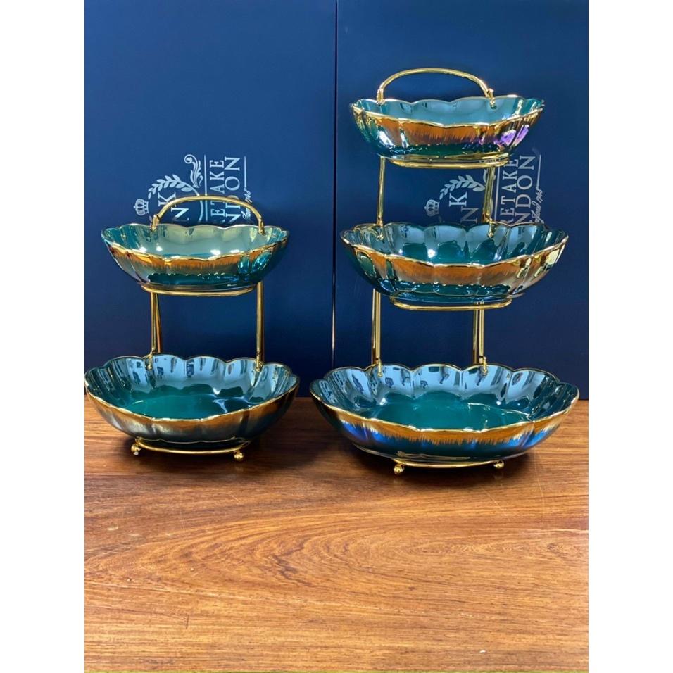 Khay đựng hoa quả, bánh kẹo, mứt Tết 2 tầng, 3 tầng bằng gốm sứ kèm đế kim loại mạ vàng cao cấp.