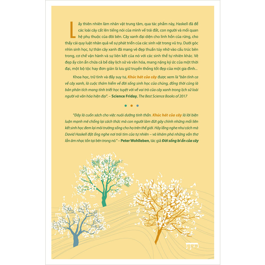"Đây là cuốn sách cho việc nuôi dưỡng tinh thần. Khúc Hát Của Cây là lời biện luận mạnh mẽ chống lại cách thức mà con người làm đứt gãy chính những mối liên kết sinh học đem lại môi trường sống cho họ trên thế giới. Hãy lắng nghe như cách mà David Haskell đặt ống nghe nơi trái tim của tự nhiên - và khám phá những vần thơ lẫn âm nhạc tồn tại bên trong nó."