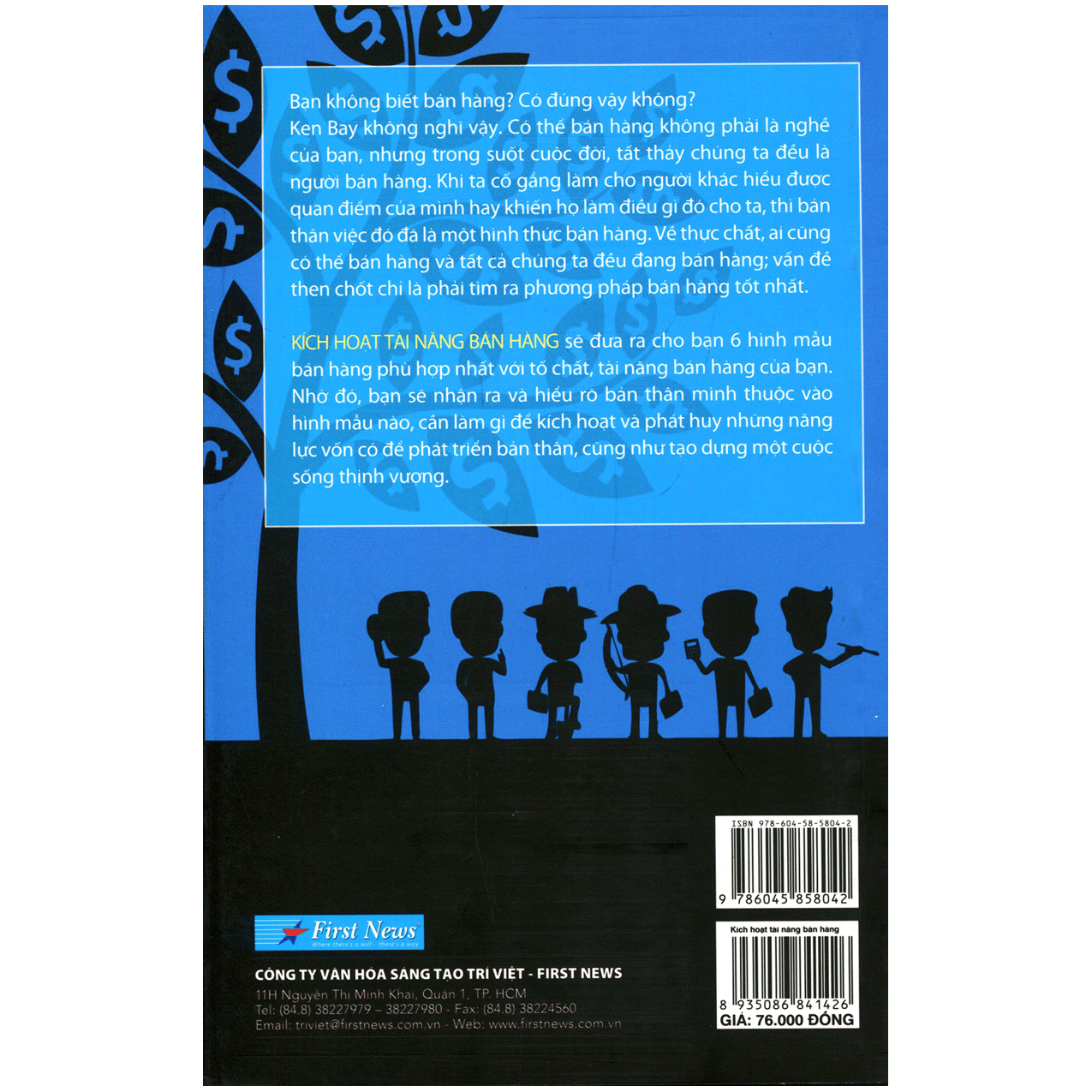 Kích Hoạt Tài Năng Bán Hàng Cuốn sách này dành cho những ai muốn thay đổi khả năng bán hàng để tạo ra bước đột phá doanh số cao nhất. Tất cả chúng ta đều là người bán hàng. Nhưng không phải ai cũng có được một tài năng bán hàng như nhau. Trước hết, để trở thành một chuyên gia bán hàng xuất sắc bạn cần phải có niềm đam mê, tận tâm và nỗ lực thì mới có thể chiến thắng và thuyết phục những khách hàng khó tính nhất. Để làm điều này, không phải bạn không có tố chất hay năng lực về bán hàng mà là bạn chưa có cơ hội để kích hoạt tiềm năng của chính bản thân mình. Với cuốn sách Kích Hoạt Tài Năng Bán Hàng sẽ là một bản đồ hướng dẫn thông minh, khai mở và phát huy tài năng bán hàng trong bạn, vẽ lối và chỉ dẫn bạn đến đúng đích điểm để chinh phục và chiến thắng. Kích Hoạt Tài Năng Bán Hàng là một chương trình đào tạo, hay là một bản nghiên cứu thiết thực được một người bán hàng thành công trình bày gói gọn một chương trình và các công cụ đào tạo tuyệt vời. Với bề dày kinh nghiệm bán hàng cùng với tư tưởng rõ ràng và đơn giản, Ken Bay thực sự là một nhà khoa học về "Bán hàng". Anh đã chứng minh rằng tất cả mọi người đều có thể bán hàng một cách phi hệ thống. Dựa theo 6 hình mẫu bán hàng đại diện cho 6 kiểu người khác nhau, Ken Bay đã đưa ra cho chúng ta những hình ảnh sinh động về nhiều hình mẫu bán hàng khác nhau. Kích Hoạt Tài Năng Bán Hàng đã thật sự lột tả được bản chất toàn diện của việc muốn trở thành một chuyên gia bán hàng thành công thì cần phải làm gì. Bằng những câu chữ rất đơn giản, dễ hiểu, quyển sách là một công cụ xuất sắc không chỉ cho những ai đang khao khát cải thiện bản thân trở thành chuyên gia bán hàng mà còn dành cho cả giới lãnh đạo bán hàng đang tìm kiếm một bản hướng dẫn đáng tin cậy để phát triển một chương trình đào tạo nền tảng cho đội ngũ nhân viên bán hàng của mình. Darren Lee, Giám đốc Định hướng Chiến lược và Đào tạo Bán hàng Công ty Savills Residential chia sẻ: Người bán hàng đỉnh cao phải biết được họ là ai và làm thế nào có thể phát huy sức mạnh để đáp ứng thị trường đang ngày càng thay đổi nhanh chóng như hiện nay. Kích Hoạt Tài Năng Bán Hàng chỉ rõ rằng sau khi áp dụng 6 hình mẫu bán hàng, người bán hàng sẽ đạt đến đỉnh cao nhất. Với 6 hình mẫu bán hàng độc đáo: Hình mẫu thợ săn; Họa sĩ; Diễn viên; Nhà tư vấn; Kiến trúc sư; Nông dân; và 12 Bước trong quy trình bánh hàng, mà Ken đã đề cập trong cuốn sách sẽ là kim chỉ nam dẫn nhập, phân tích cụ thể, chi tiết xuyên suốt cuốn sách. Mong rằng với những trang sách ý nghĩa này sẽ giúp hiện thực hóa các tài năng bán hàng tự nhiên của bạn và trở thành nhà sản xuất, xuất sắc, ưu việt. Để trở thành một nhân viên bán hàng giỏi nằm ngay trong chính bản thân bạn, hãy cố gắng tận dụng mọi thời cơ và phát huy hết khả năng của mình. Sự cố gắng và nỗ lực của bạn sẽ được đền đáp một cách xứng đáng bằng chính thu nhập và doanh số mà bạn bán ra. Chúc bạn sớm trở thành những chuyên gia bán hàng hàng đầu.