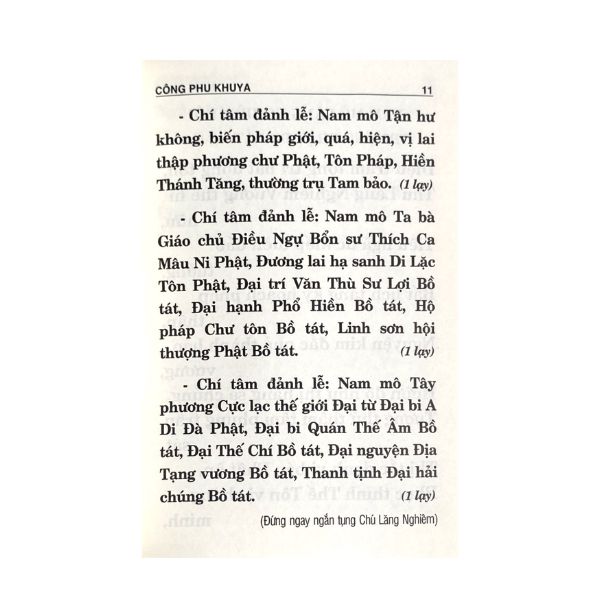 KINH NHẬT TỤNG (KHỔ NHỎ) MỤC LỤC: NGHI THỨC CÔNG PHU KHUYA NGHI THỨC CÔNG PHU CHIỀU: KINH A DI ĐÀ, HỒNG DANH SÁM HỐI, MÔNG SƠN THÍ THỰC NGHI THỨC CẦU AN NGHI THỨC TỤNG KINH KIM CANG NGHI THỨC LỄ VU LAN BỒN: KINH HẠ SANH DI LẶC THÀNH PHẬT NGHI THỨC LỄ KHÁNH ĐẢN NGHI THỨC LỄ AN VỊ PHẬT NGHI THỨC CÚNG NGỌ NGHI THỨC QUÁ ĐƯỜNG NGHI THỨC KỆ ĐẠI HỒNG CHUNG: KỆ CHUYỂN TRỐNG NGHI THỨC PHÓNG SANH CÁC BÀI SÁM: SÁM THÍCH CA, SÁM DI ĐÀ, SÁM NHỨT TÂM NGHĨA, SÁM HỐI PHÁT NGUYỆN, SÁM ĐẠI TỪ, SÁM PHÁT NGUYỆN, SÁM QUAN ÂM, SÁM NHỨT TÂM, BÀI NGUYỆN CHƯ THIÊN CÁC NGÀY LỄ KỶ NIỆM NHỮNG NGÀY TRAI