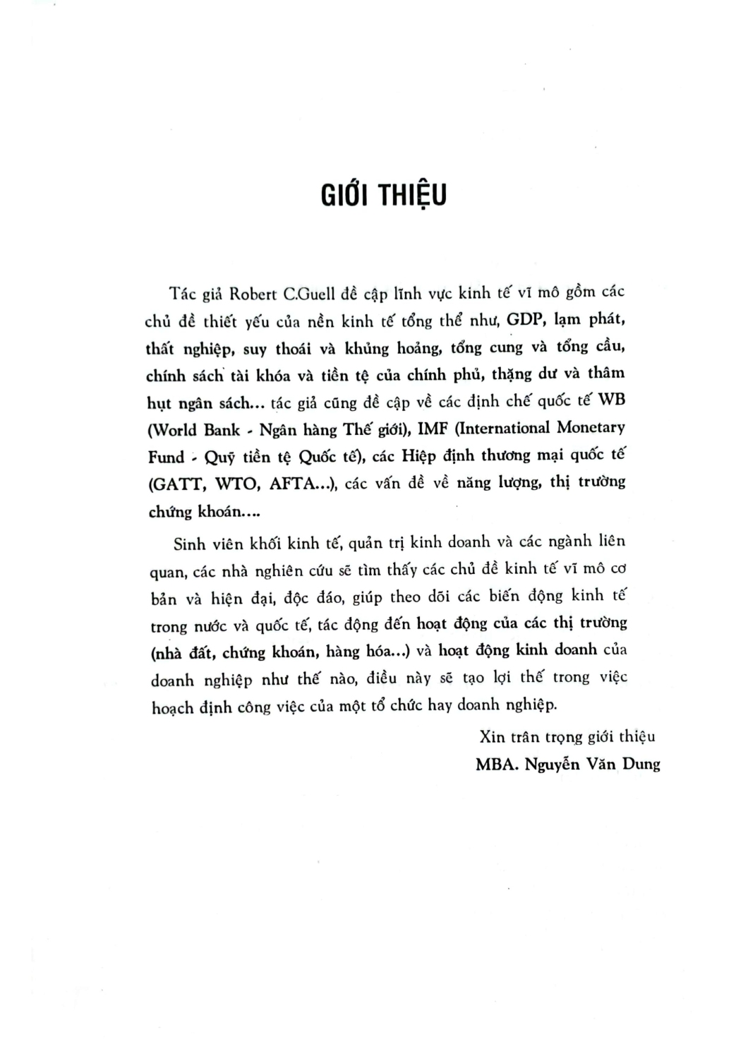 Xu thế hội nhập toàn cầu là động lực thúc đẩy sự phát triển kinh tế của các quốc gia trên thế giới. Xu hướng này vừa là một thách thức vừa là một cơ hội để các quốc gia đang trên đà phát triển như Việt Nam tự khẳng định mình. Vì vậy, sự am hiểu về các vấn đề kinh tế ở cấp vĩ mô như lạm phát, thất nghiệp, chính sách tài khoản, chính sách tiền tệ... của một quốc gia là điều hết sức cần thiết đối với sinh viên Đại học ngành Quản trị kinh doanh nói riêng và với sinh viên khối ngành Kinh tế nói chung.