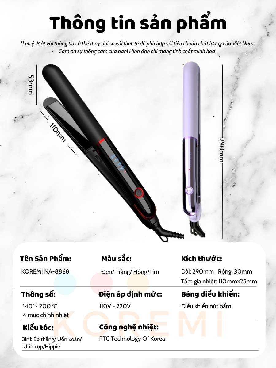 - Sản phẩm KOREMI có dán tem Bảo Hành ĐiệnTử, tem chống hàng giả Vui lòng kích hoạt bảo hành để bảo đảm quyền lợi của bạn. KOREMI ước mong được phục vụ Bạn. MÁY ÉP DUỖI TÓC CAO CẤP KIỂU HÀN QUỐC Koremi NA-8868 ( Phiên bản cải tiến mới 2022 vượt trội hơn, tiện lợi hơn) · Chiếc máy ép duỗi tóc Koremi NA-8868 được sản xuất theo công nghệ hiện đại tiên tiến từ Hàn Quốc kết hợp 2 chức năng vừa làm xoăn khi uốn tóc, vừa làm thẳng tóc khi duỗi. Với chiếc máy uốn duỗi tóc này bạn sẽ thoải mái khi ép duỗi tóc hay uốn xoăn tóc mà không lo máy bị quả tải và chờ lâu như khi bạn sử dụng máy ép loại mini. Tấm gia nhiệt dài tiện dụng giúp bạn tiết kiệm thời gian gấp 5 lần Đèn LED thông báo mức nhiệt đang hoạt động. Dây điện xoay 360 độ cùng Nút POWER trong thân máy gọn gàng khi thao tác. Máy nóng nhanh chỉ trong 10 giây, với công nghệ độc quyên PTC từ Hàn Quốc tạo được nhiệt độ nóng đều không bị vượt ngưỡng giúp bảo vệ được mái tóc của bạn. Thanh gia nhiệt kết hợp cùng lớp phủ Ceramic Tourmaline giúp mái tóc bạn chống hư tổn tuyệt đối. Gốm là vật liệu tốt và tiên tiến nhất hiện nay được ứng dụng trong các thiết bị làm tóc gia nhiệt PTC giúp bảo vệ và tránh hư tổn tối đa cho mái tóc của bạn. Giúp kẹp tóc nhanh, kéo tóc không bị rít, và không làm dứt tóc. Bổ sung gấp đôi lượng ion âm giúp bảo vệ lớp biểu bì của tóc, tránh làm lớp biểu bì bong tróc do tiếp xúc với nhiệt, từ đó duy trì độ ẩm và làm tóc suôn mượt. *** ️ Chúng Tôi Cam Kết 100% Sản Phẩm Đều Được Bảo Hành Chính Hãng: 1 đổi 1 với tất cả lỗi của nhà sản xuất trong thời gian 3 tháng ( Quý khách cũng có thể mua thêm gói bảo hành) Đặc điểm kỹ thuật: Có 4 mức chỉnh nhiệt: (140 ° C - 200 ° C). Phù hợp cho mọi loại tóc : Mềm, Thường, Dày, Khô Sử dụng cho cả 2 loại tóc ướt và Khô : Duỗi tóc thẳng / Uốn tóc xoăn / khóa bên trong và bên ngoài Công suất định mức: 35W Điện áp định mức: 110v-220v Tần số định mức: 50Hz/ 60Hz Bảo vệ quá nhiệt: Có ( Tự tắt sau 60 phút) Nhiệt độ tăng nhanh: 10S và ổn định Bảng điều khiển: Nút bấm ON/OFF tiện lợi Lớp men phủ gốm: Gốm Tourmaline giúp chống hư tổn tuyệt đối. Lựa chọn màu: đen / trắng / hồng Phương pháp gia nhiệt: Phần tử gia nhiệt PTC theo công nghệ tiên tiến độc quyền từ Hàn Quốc Trọng lượng tịnh của sản phẩm: 350G Chiều dài dây: 1,8M