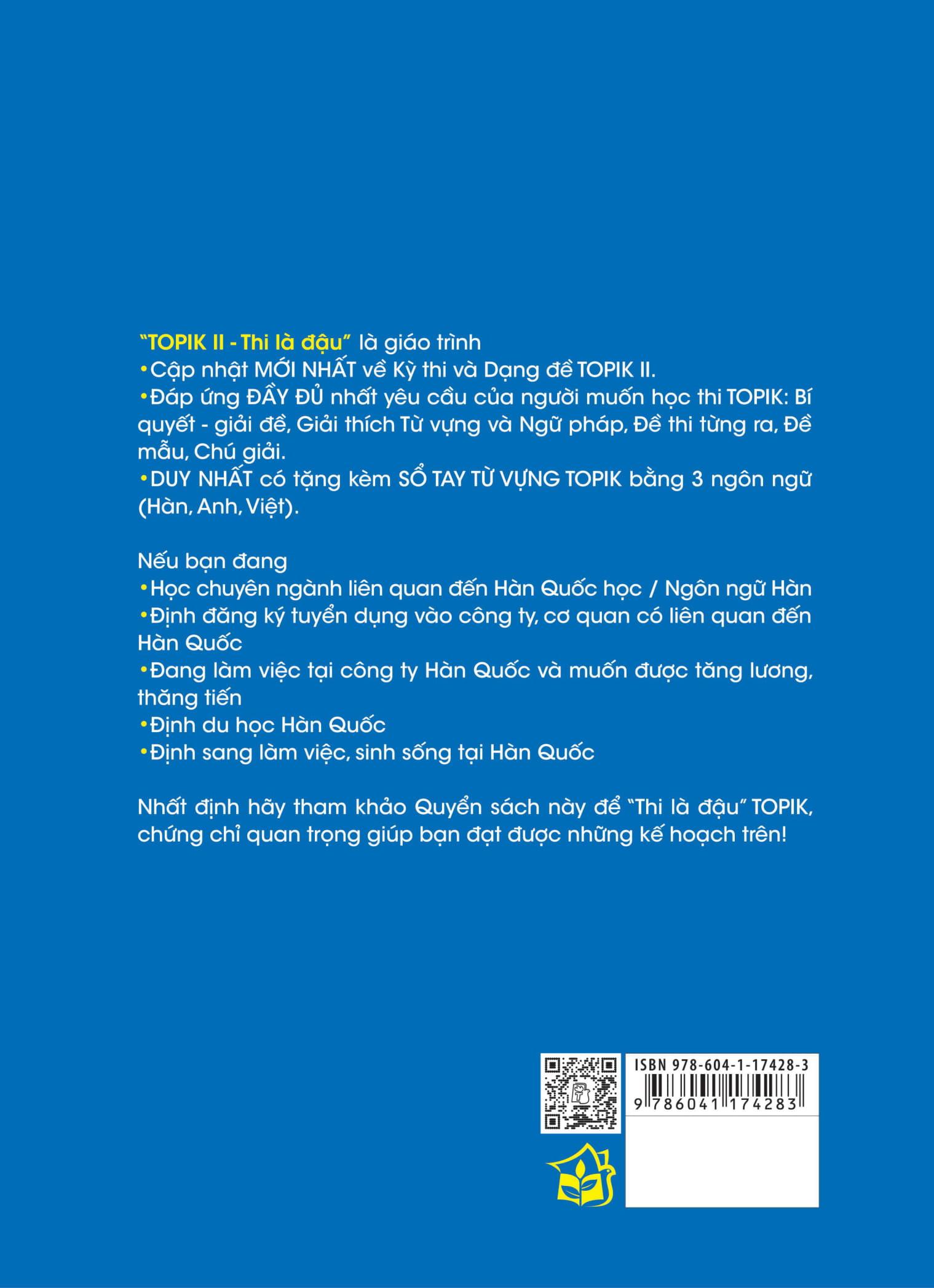 Mua tại Tiktok“TOPIK II - Thi là đậu” là giáo trình cập nhật mới nhất về kỳ thi và các dạng đề TOPIK II. Giáo trình cũng đáp ứng đầy đủ nhất yêu cầu của người muốn học thi TOPIK, với những nội dung “Bí quyết giải đề”, “Giải thích Từ vựng và Ngữ pháp”, “Đề thi từng ra”, “Đề mẫu”, và “Chú giải”. Ngoài ra còn có “Sổ tay từ vựng” TOPIK với 3 ngôn ngữ Hàn, Anh, Việt chỉ có duy nhất trong giáo trình này. “TOPIK II - Thi là đậu” là giáo trình không thể thiếu dành cho các đối tượng đang: