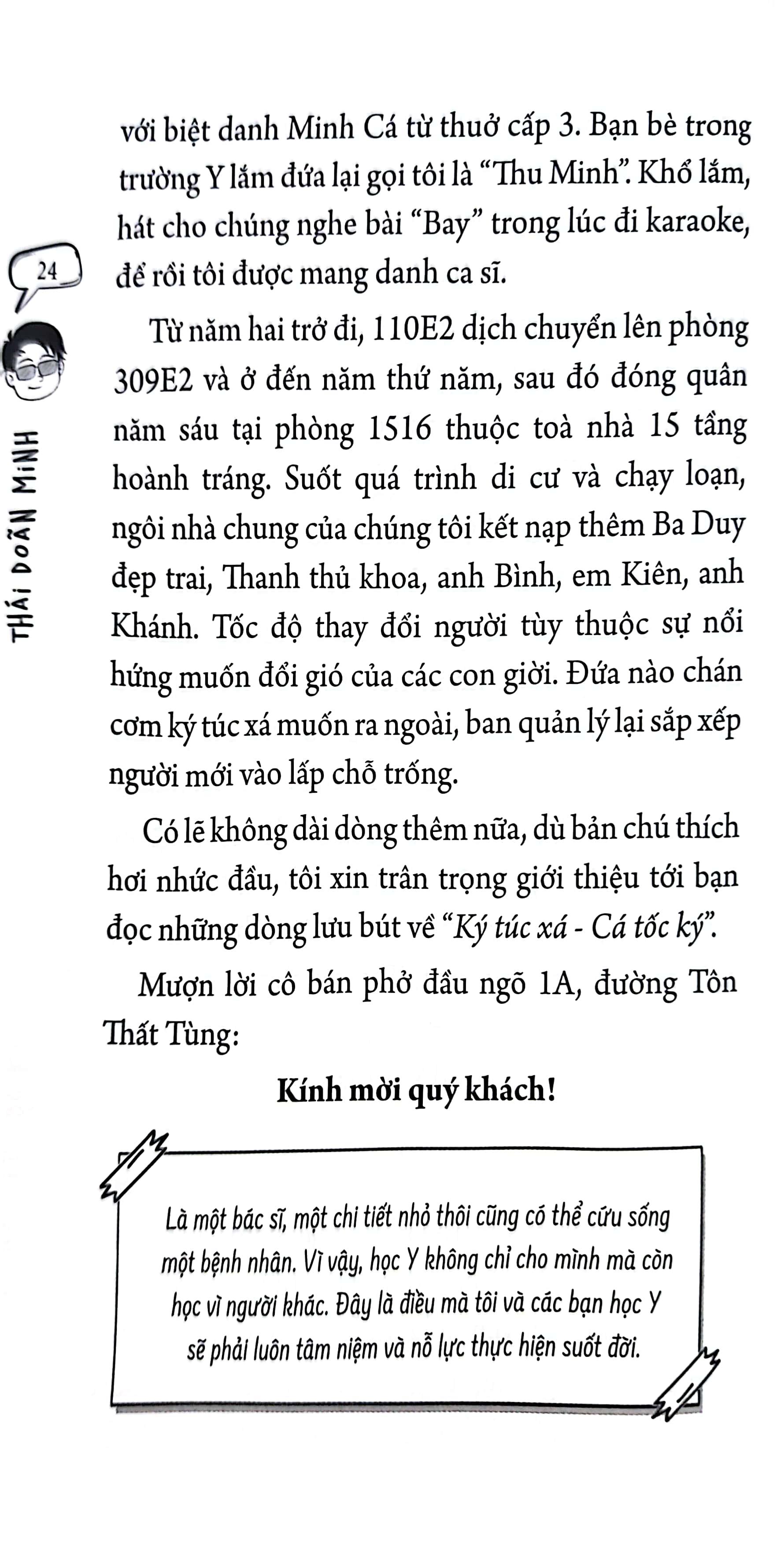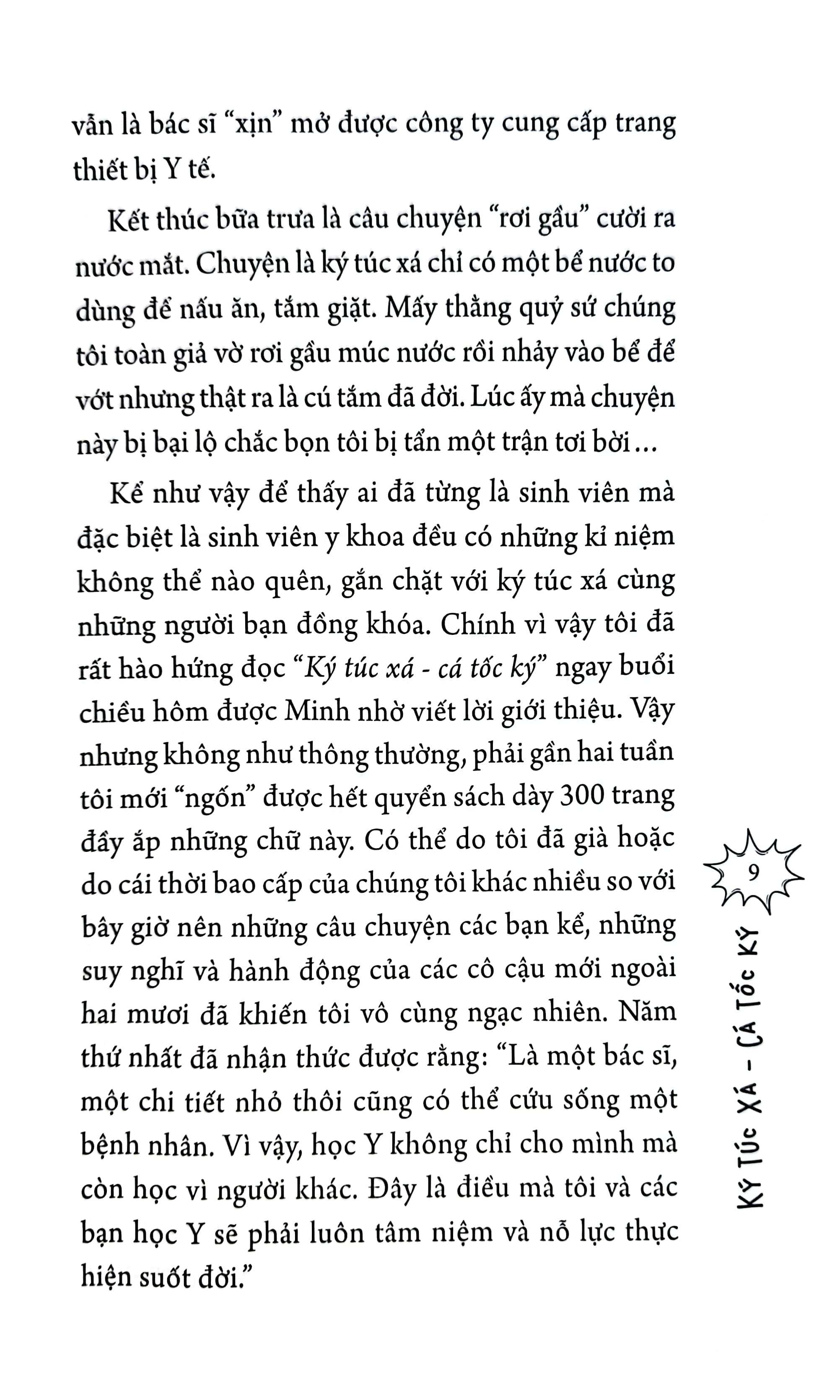 Kể như vậy để thấy ai đã từng là sinh viên mà đặc biệt là sinh viên y khoa đều có những kỷ niệm không thể nào quên, gắn chặt với ký túc xá cùng những người bạn đồng khoá. Chính vì vậy tôi đã rất hào hứng đọc “Ký túc xá - cá tốc ký” ngay buổi chiều hôm được Minh nhờ viết lời giới thiệu. Vậy nhưng không như thông thường, phải gần hai tuần tôi mới “ngốn” được hết quyển sách dày gần 300 trang đầy ắp những chữ này. Có thể do tôi đã già hoặc do cái thời bao cấp của chúng tôi khác nhiều so với bây giờ nên những câu chuyện các bạn kể, những suy nghĩ và hành động của các cô cậu mới ngoài 20 đã khiến tôi vô cùng ngạc nhiên. Năm thứ nhất đã nhận thức được rằng: “Là một bác sĩ, một chi tiết nhỏ thôi cũng có thể cứu sống một bệnh nhân. Vì vậy, học Y không chỉ cho m.ình mà còn học vì người khác. Đây là điều mà tôi và các bạn học Y sẽ phải luôn tâm niệm và nỗ lực thực hiện suốt đời.”