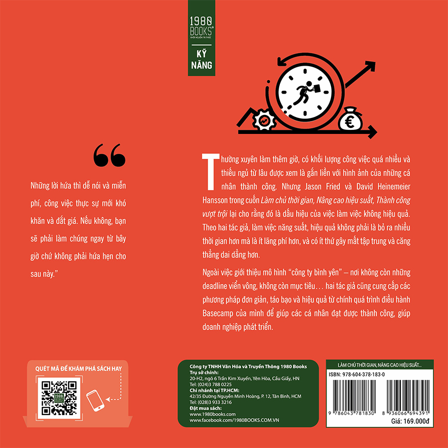 Trong “Làm chủ thời gian, nâng cao hiệu suất, thành công vượt trội”, các tác giả chia sẻ những gì đã được áp dụng và thành công tại doanh nghiệp của họ, cùng các cách tiếp cận và nhận thức về những điều giúp một công ty tăng trưởng mạnh mẽ, bền vững và trường tồn. Những công ty khác nhau sẽ có sự tăng trưởng khác nhau. Vì vậy, hãy tiếp nhận những ý tưởng trong cuốn sách này như một nguồn cảm hứng để thay đổi.