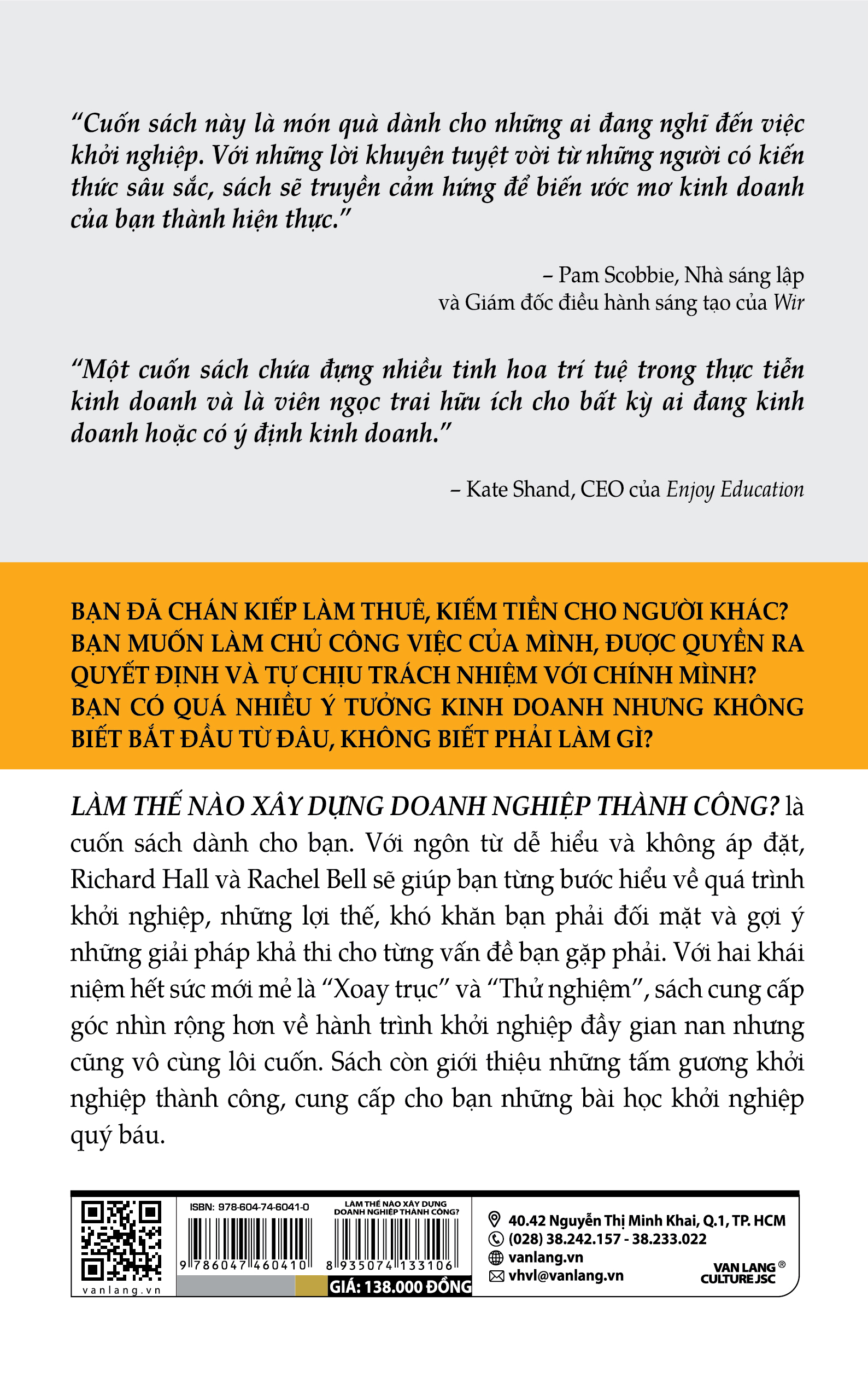 LÀM THẾ NÀO XÂY DỰNG DOANH NGHIỆP THÀNH CÔNG? là cuốn sách dành cho bạn. Với ngôn từ dễ hiểu và không áp đặt, Richard Hall và Rachel Bell sẽ giúp bạn từng bước hiểu về quá trình khởi nghiệp, những lợi thế, khó khăn bạn phải đối mặt và gợi ý những giải pháp khả thi cho từng vấn đề bạn gặp phải. Với hai khái niệm hết sức mới mẻ là “Xoay trục” và “Thử nghiệm”, sách cung cấp góc nhìn rộng hơn về hành trình khởi nghiệp đầy gian nan nhưng cũng vô cùng lôi cuốn. Sách còn giới thiệu những tấm gương khởi nghiệp thành công, cung cấp cho bạn những bài học khởi nghiệp quý báu.