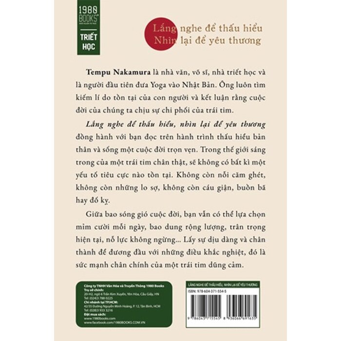 Tác giả Tempu Nakamura luôn tìm kiếm lí do tồn tại của con người từ “trạng thái của trái tim” và ông kết luận rằng cuộc đời của chúng ta chịu “sự chi phối của trái tim”. Từ quan điểm đó, cuốn sách “Lắng nghe để thấu hiểu, nhìn lại để yêu thương” này nhấn mạnh tới câu nói của nhà văn Tempu và được biên soạn một cách dễ hiểu, hơn nữa còn sử dụng những từ ngữ làm lay động trái tim, hướng tới những người luôn nung nấu ý nghĩa về cuộc sống. Hãy luôn sống vui tươi ngay cả khi bạn chỉ có một mình. Khi quen với điều này, vầng hào quang sẽ bao quanh bạn, sẽ có nhiều người bị hấp dẫn bởi điều đó và bạn sẽ có thêm thật nhiều bạn bè. Nhà văn Tempu cho rằng việc sống một cách tự nhiên chính là như vậy.