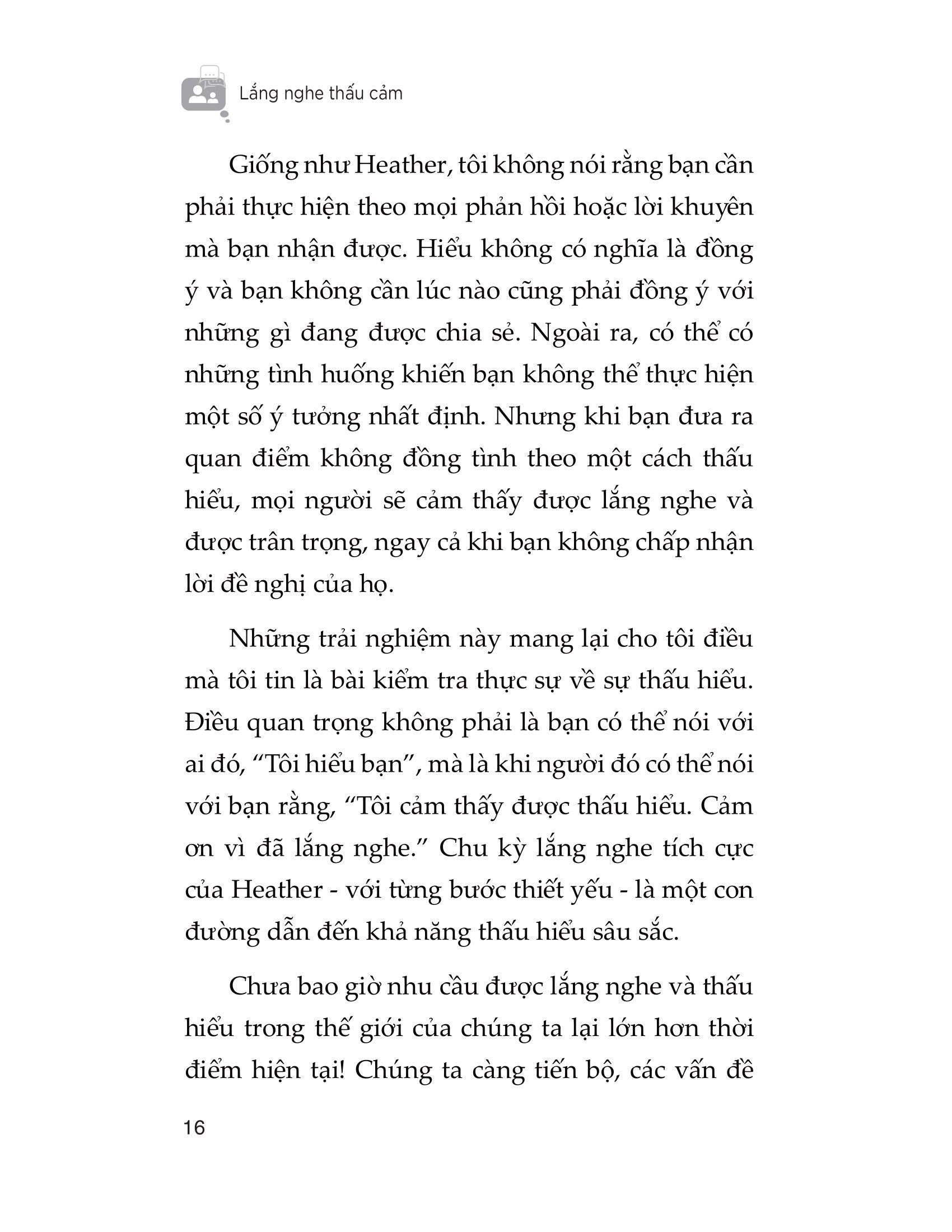 Lắng Nghe Thấu Cảm Trong thế giới hiện đại ngày nay, nhu cầu được lắng nghe và thấu hiểu trở nên lớn hơn bao giờ hết. Xã hội càng tiến bộ, các vấn đề con người gặp phải càng trở nên phức tạp. Việc tiếp cận thông tin không giới hạn có thể cực kỳ hữu ích, nhưng nó cũng có thể gây hao tổn tâm sức, khiến sự chú tâm mà chúng ta dành cho những người xung quanh bị tổn hại. Ngày nay, “tiếng ồn” xuất hiện nhiều hơn bất kỳ giai đoạn nào trước đây. Với tất cả các nền tảng giao tiếp điện tử và phương tiện truyền thông xã hội, việc nói chuyện chưa bao giờ dễ dàng hơn thế và lắng nghe hiệu quả chưa bao giờ trở nên khó khăn đến vậy. Với tất cả những ai đang gặp khó khăn về vấn đề giao tiếp, đặc biệt là giao tiếp tại nơi làm việc, Lắng nghe thấu cảm chính là giải pháp kịp thời và cực kỳ hiệu quả. Cuốn sách của tác giả Heather Younger, hệ thống hóa một quy trình lắng nghe tích cực gồm năm bước đề cao tính ứng dụng và hành động. Quy trình này không chỉ mở ra tiềm năng của toàn bộ đội nhóm và tổ chức, mà còn giúp chúng ta mang đến cho người khác bầu không khí tích cực về cảm xúc và tâm lý - tạo ra một không gian mà mọi người cảm thấy được lắng nghe, được trân trọng và được thấu hiểu một cách chân thành. Cuốn sách là nguồn tài nguyên tham khảo hữu ích cho bất kỳ ai muốn lắng nghe - nhất là lắng nghe một cách hiệu quả - ở nơi làm việc, bao gồm những người hoạt động trong lĩnh vực bán hàng, chăm sóc khách hàng hoặc nhân sự; các cán bộ quản lý các cấp; cũng như tất cả mọi người liên quan. Tất cả các ngành và lĩnh vực kinh doanh đều có thể và nên tìm hiểu quy trình lắng nghe tích cực được phác thảo trong cuốn sách này, vì không ai có thể tránh được yêu cầu cần phải lắng nghe tích cực tại nơi làm việc. Khi học cách lắng nghe hiệu quả, bạn sẽ khám phá ra cách xây dựng các mối quan hệ bền chặt hơn tại nơi làm việc, mở ra thêm nhiều cánh cửa dành cho m.ình, cũng như thăng tiến trong sự nghiệp và cảm thấy mãn nguyện hơn trong công việc. Các tổ chức áp dụng những bài học có trong cuốn sách này có thể đạt được nhiều kết quả tích cực hơn vì những người giữ vai trò quan trọng - chẳng hạn như nhân viên và khách hàng - sẽ bắt đầu cảm thấy được lắng nghe, được trân trọng và được hỗ trợ. Điều này khiến họ quý mến tổ chức của bạn và muốn gắn bó với bạn trong thời gian dài hơn, theo những cách to lớn hơn cũng như hiệu quả hơn. Khi chúng ta thực hiện kỹ năng lắng nghe một cách đúng đắn, những nhân viên khác sẽ cảm thấy sự thân thuộc và muốn ở lại, còn khách hàng của chúng ta sẽ cảm thấy được tôn trọng và hỗ trợ. Cuối cùng, điều đó sẽ xây đắp lòng trung thành bền vững hơn từ những người nhân viên và khách hàng, cũng như xây dựng nên một thế giới gồm những người biết rằng họ là những cá nhân quan trọng. Về tác giả Heather R. Younger là người sáng lập kiêm CEO của Employee Fanatix, một công ty tiên phong về tư vấn và gắn kết nhân viên. Cô là diễn giả nổi tiếng về chủ đề xây dựng văn hóa tại nơi làm việc, thể hiện trên sân khấu những thông tin sâu sắc nhất được rút ra từ hơn 30.000 câu chuyện của các cá nhân. Heather là một chiến lược gia về sự đa dạng, công bằng và hòa nhập, đồng thời là chuyên gia hàng đầu thế giới về nghệ thuật lắng nghe tại nơi làm việc. Heather là tác giả của hai cuốn sách bán chạy nhất: The 7 Intuitive Laws of Employee Loyalty - được Forbes đánh giá là một trong những cuốn sách “Phải đọc” đối với các chuyên gia nhân sự, và The Art of Caring Leadership - hướng dẫn về sức mạnh của sự hỗ trợ và quan tâm trong hoạt động lãnh đạo.