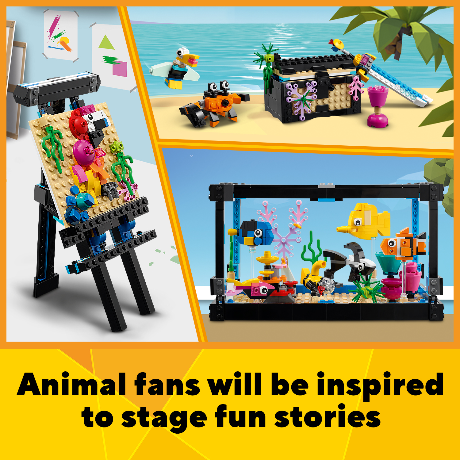 Bộ LEGO Creator 3in1 này cung cấp 3 mô hình chi tiết rực rỡ để bạn xây dựng và chơi cùng. Trẻ em có thể tạo đồ chơi Bể cá với những con cá đáng yêu, sau đó xây dựng lại nó thành đồ chơi giá vẽ hoặc thậm chí sử dụng trí tưởng tượng của mình để tạo ra thứ gì đó mới!