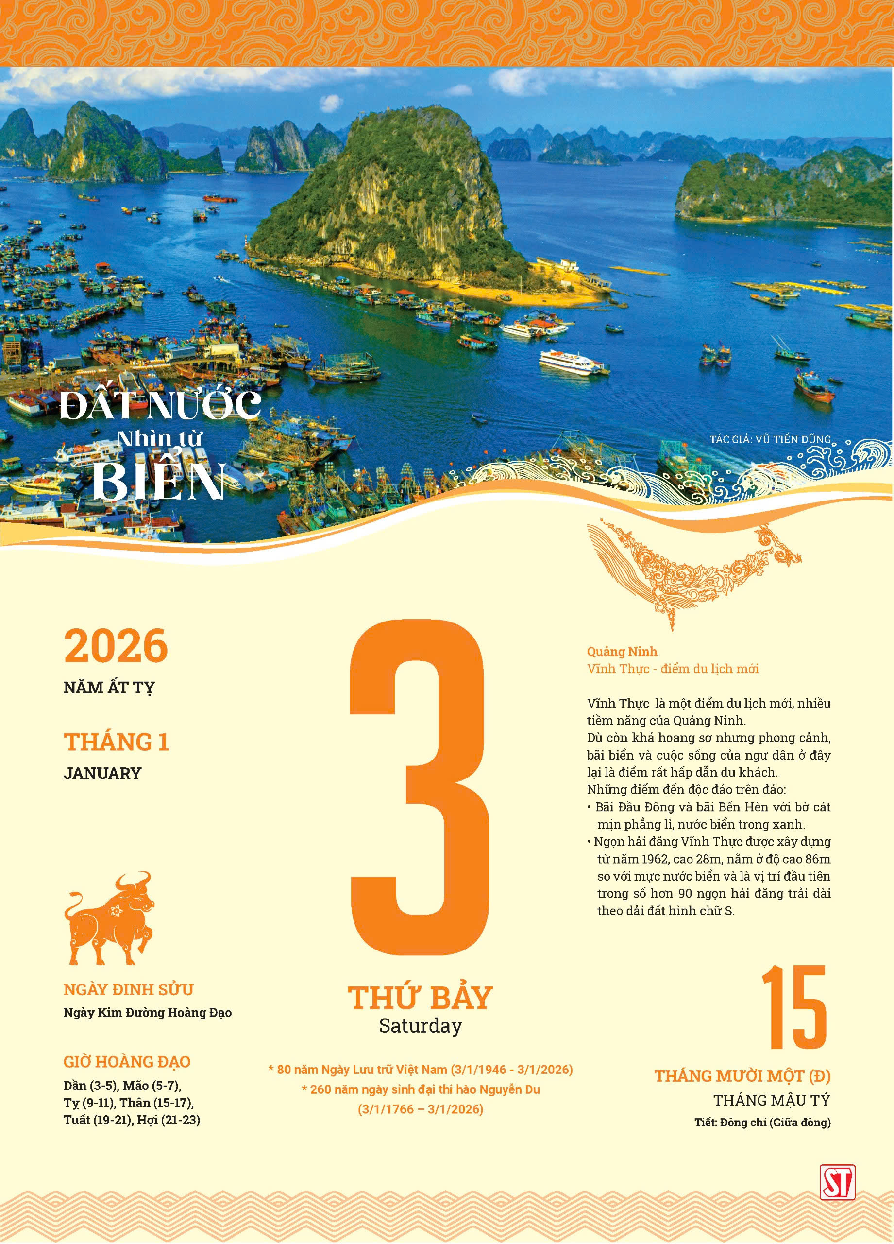 Lịch Blốc 2026 “Đất nước nhìn từ biển” Quy cách kỹ thuật KT: 25 x 35 cm - Giá: 400.000 - In 4 màu trên giấy couches 64gsm - Bìa in bằng công nghệ mới