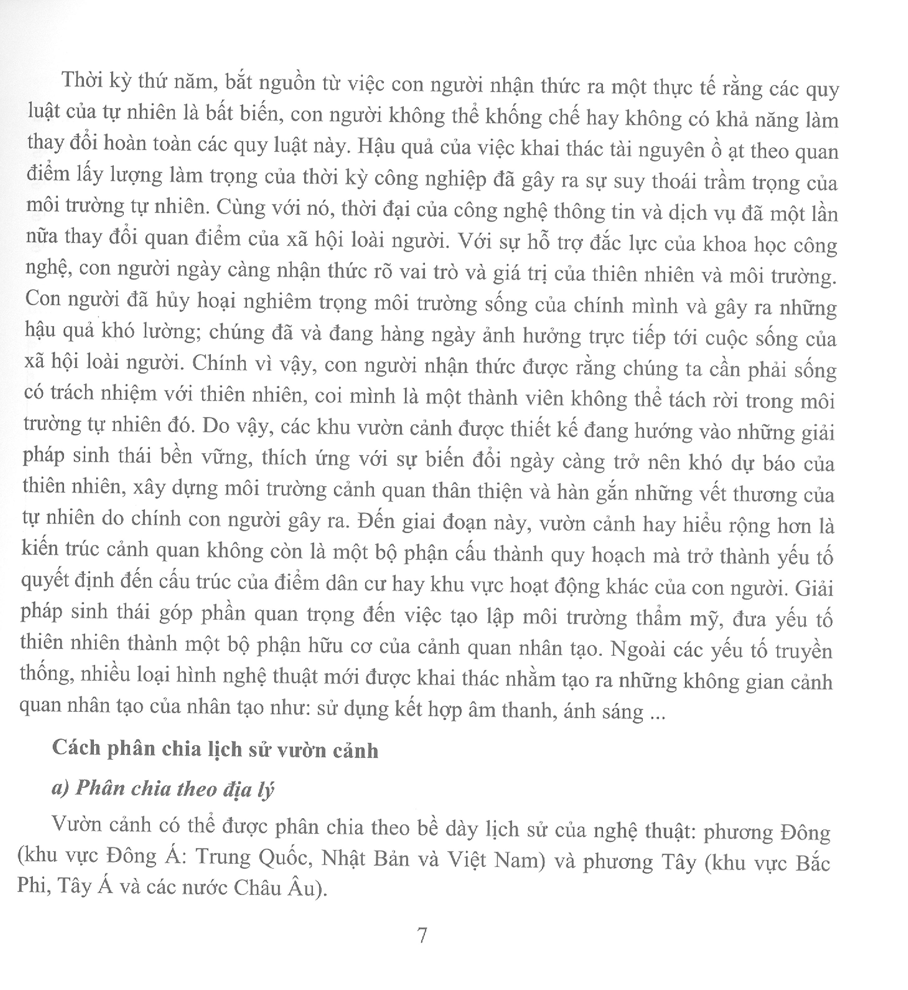 Cuốn sách “Lịch sử vườn cảnh” được biên soạn nhằm cung cấp các thông tin về điều kiện, lịch sử hình thành và phát trin, những nét đặc trưng, các nguyên tắc cơ bản trong bố cục, tạo hình và tô chức không gian của các loại hình vườn cảnh tiêu biêu, có ảnh hưởng nhiều tới nhận thức và giá trị thẩm mỹ của cảnh quan trên Thế giới và Việt Nam.