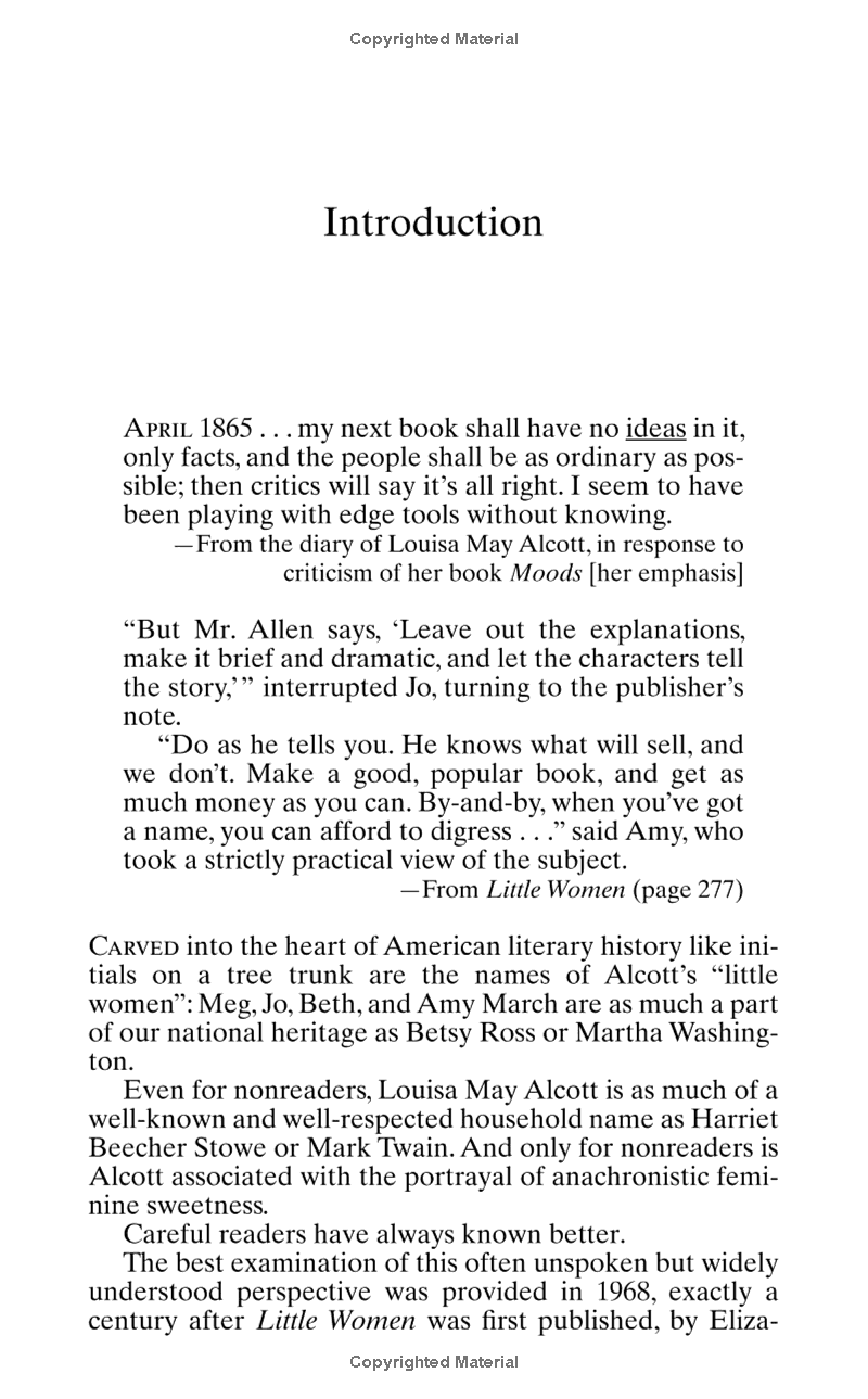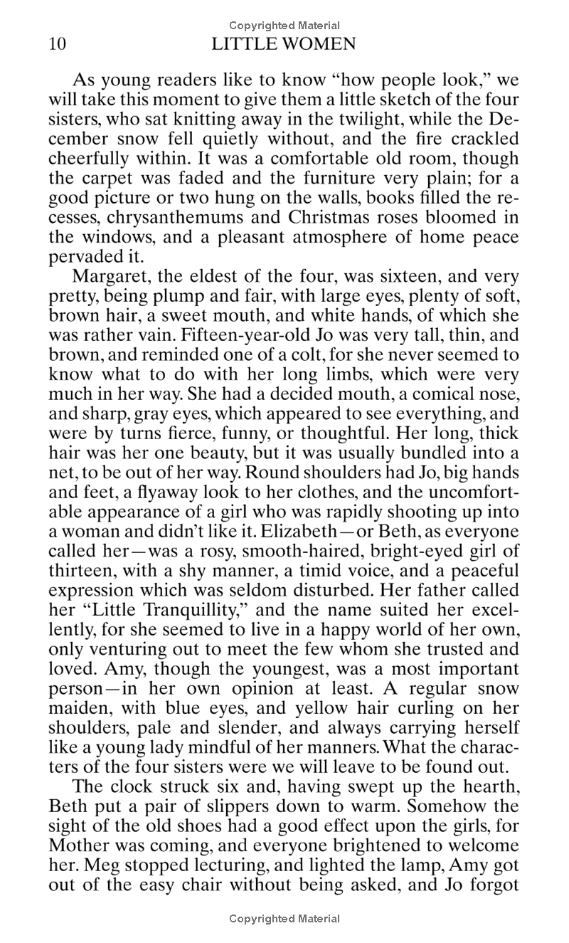 The four March sisters--Meg, Amy, Beth, and feisty Jo--share the joys and sorrows of growing up while their father is away at war. The family is poor in worldly goods, but rich in love and