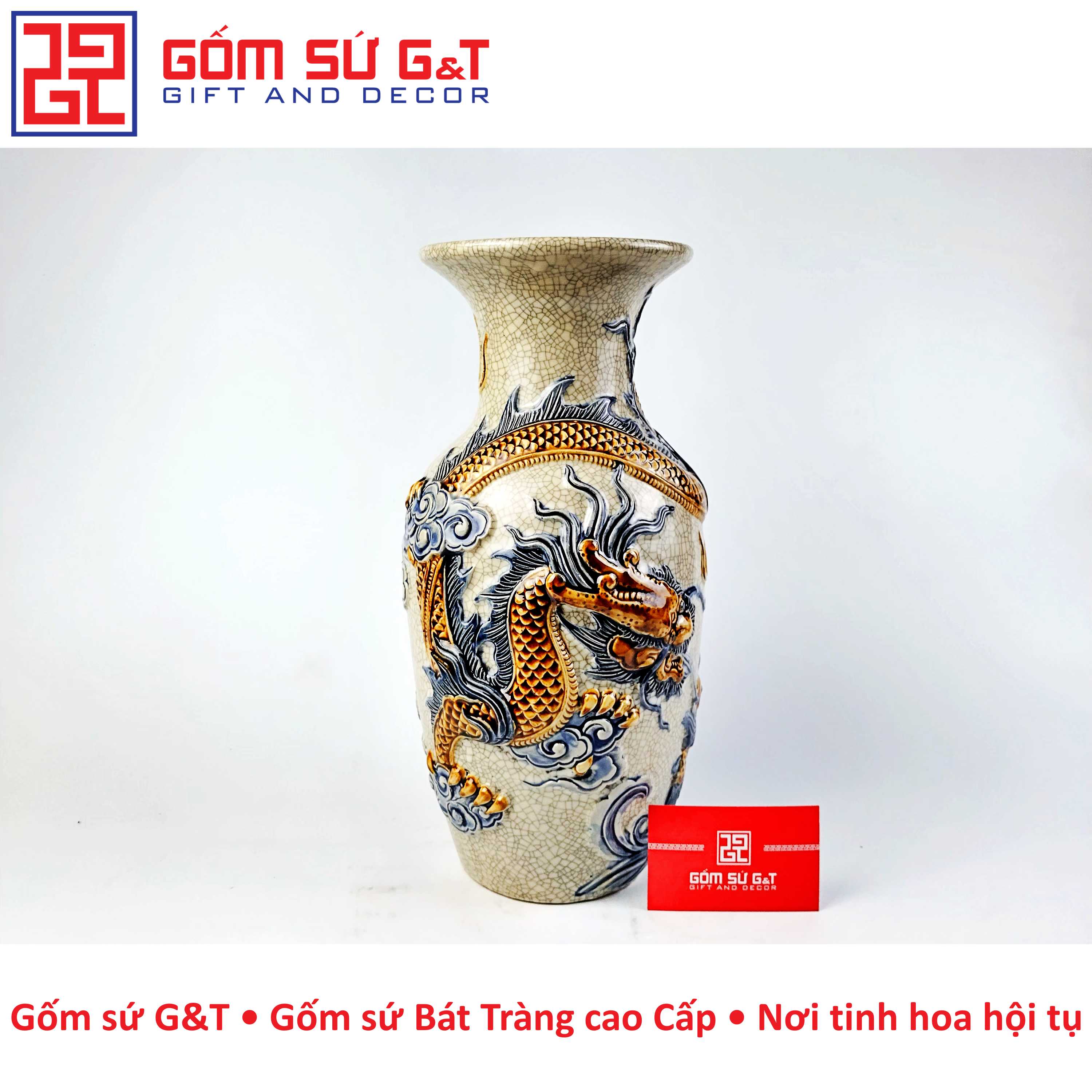 Lọ lộc bình men rạn đắp rồng được làm thủ công bằng kỹ thuật đắp nổi trên bề mặt men rạn. Các họa tiết và chi tiết với hình ảnh con rồng được tạo ra một cách tỉ mỉ và tinh xảo, tạo nên một sản phẩm gốm nghệ thuật độc đáo và hấp dẫn.