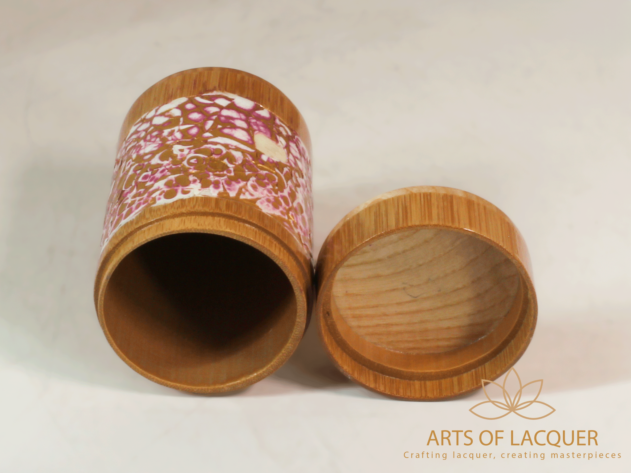Sản phẩm trong hình là "Lọ Tre Sơn Mài Khảm Trai Tím" từ Arts of Lacquer. Hộp có thiết kế tròn với nền màu vàng nhạt và tím, được trang trí bằng hoa văn tinh