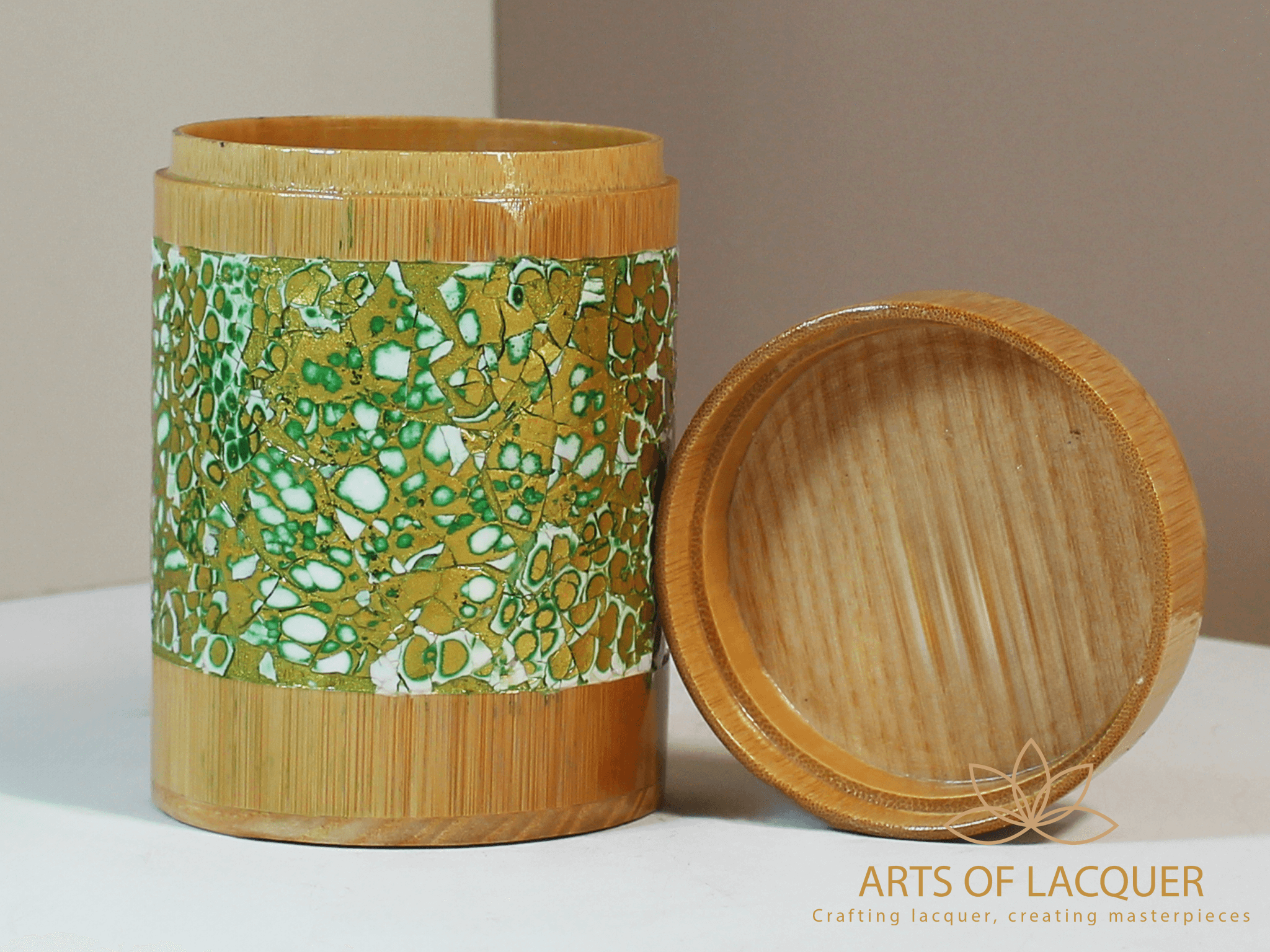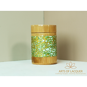 Sản phẩm trong hình là "Lọ Tre Sơn Mài Xanh Lá Cây" từ Arts of Lacquer. Hộp có thiết kế tròn với nền màu vàng nhạt và vảy xanh lá cây, được trang trí bằng