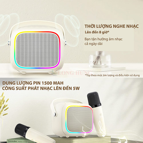 • Thời gian sạc: Loa - 3 giờ, Micro - 1,5 giờ