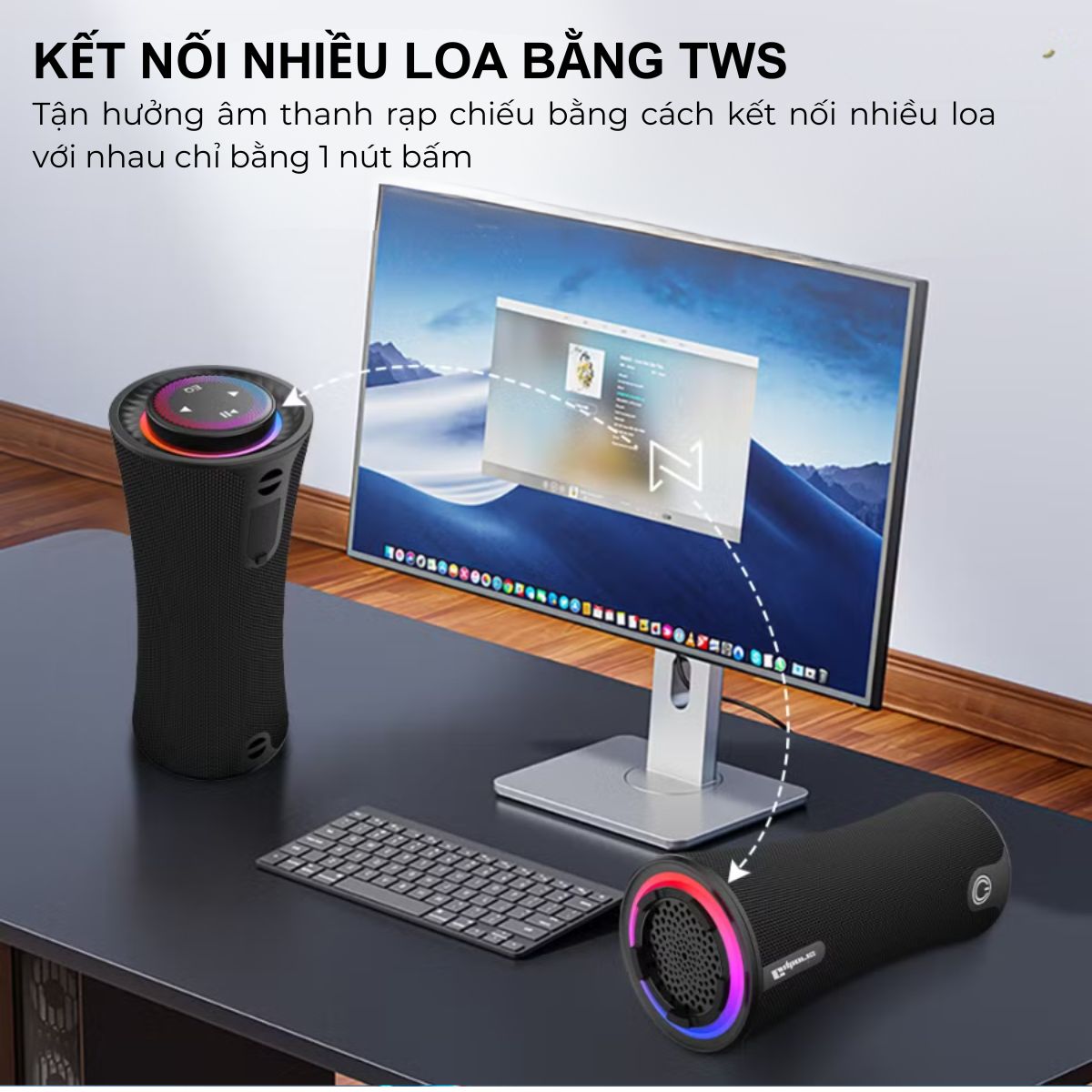 ️ Kết nối không dây TWS giúp ghép đôi 2 loa, nhân đôi công suất lên 160W, tạo trải nghiệm âm thanh đồng bộ.
