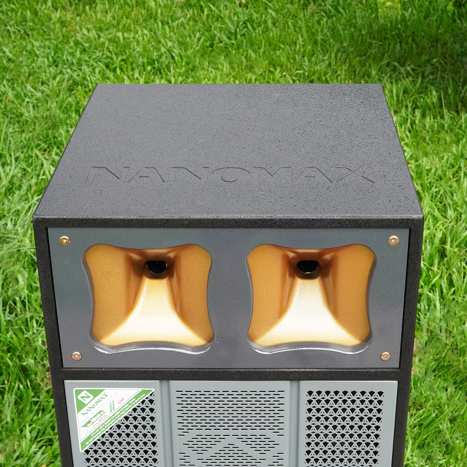 Loa karaoke điện Nanomax PRO-803B được chế tác với đường nét gọn gàng, hình dạng tối giản, sang trọng với gam màu đen phối xám sang trọng, thùng loa bằng chất liệu gỗ sơn chống