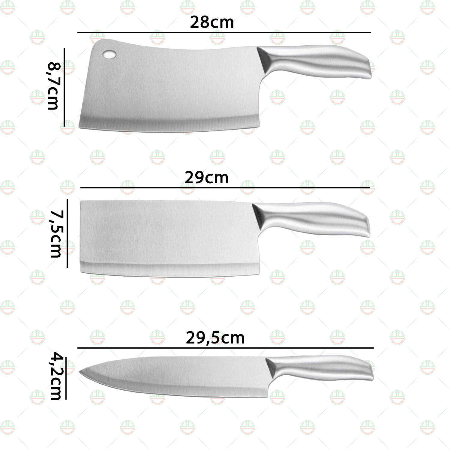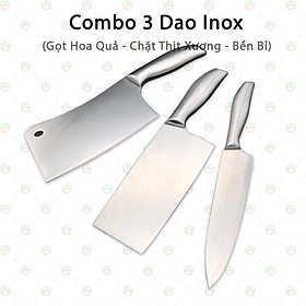 - Bộ dao inox 3 món kiểu Nhật Bản bao gồm: – 1 dao lớn thái thịt, chặt gà dài 31 cm, lưỡi dài 18 cm – 1 dao thái, gọt trái cây, rau củ quả dài 25 cm, lưỡi dài 12.5 cm – 1 dao gọt trái cây dài 21 cm, lưỡi dài 10.5 cm