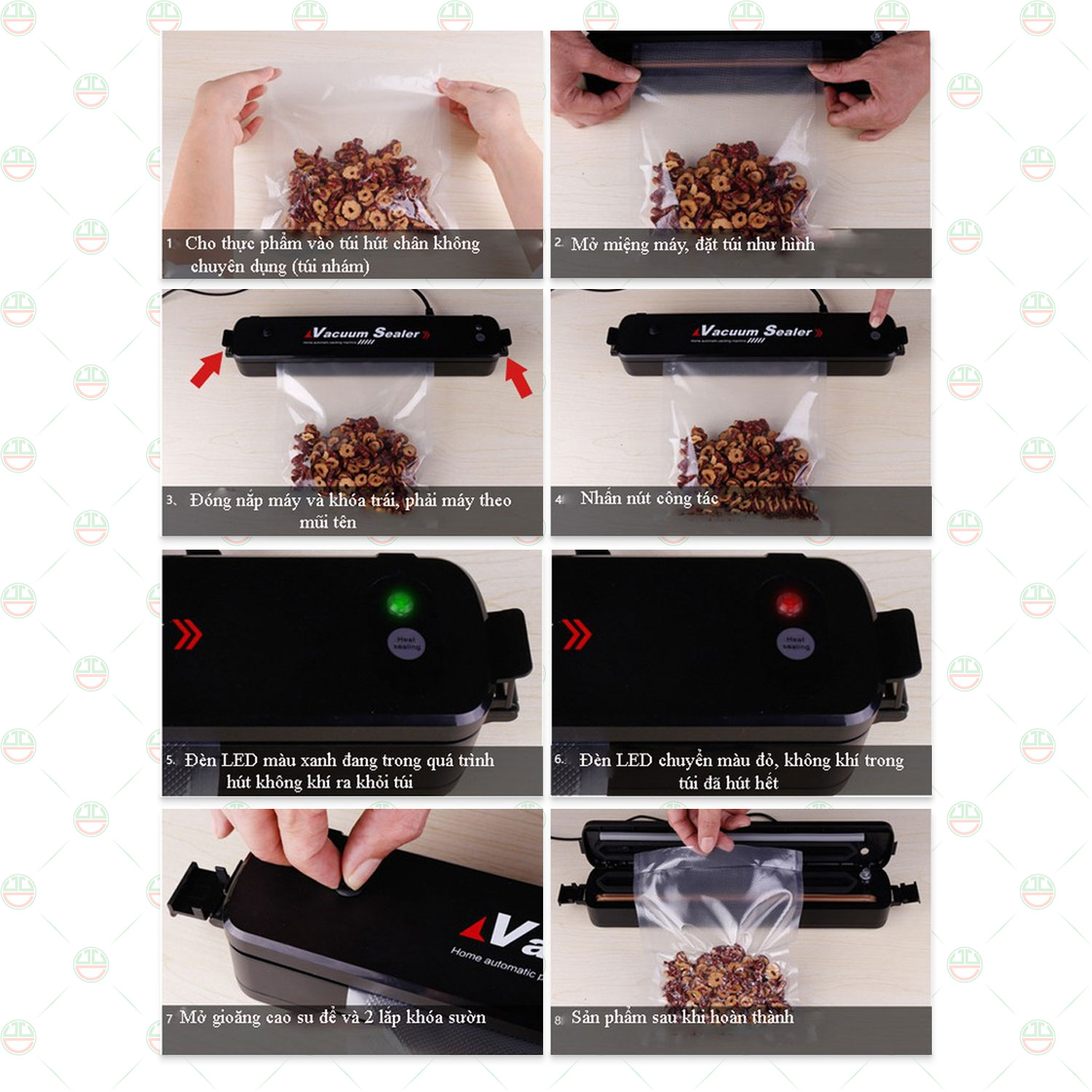 - CÁCH HÚT CHÂN KHÔNG ĐƠN GIẢN VỚI MÁY HÚT CHÂN KHÔNG Sản phẩm tiện dụng cho gia đình và rất dễ sử dụng, chưa đầy 15 giây là bạn đã có thể đóng gói sản phẩm tốt nhất. Bước 1: Mở lắp cài khóa 2 bên của máy, sau đó cho túi hút đưng thực phẩm vào trong khoang má Bước 2: Cài khóa hai bên nắp máy hút và bấm nút "nguồn" máy màu xanh sẽ tự động hút sạch không khí bên trong bao bì. Bước 3: Sau khi đèn trạng thái bên tay phải chuyển sang màu đỏ, nhấc nhẹ núm cao su bên tay trái của máy Bước 4: Tắt nguồn và mở hai bên khóa sau đó lấy thành phẩm đã được hút chân khô