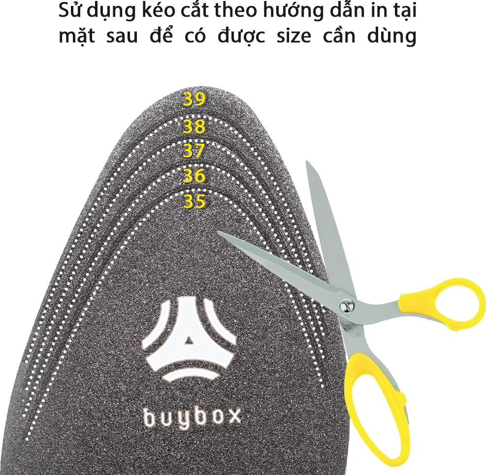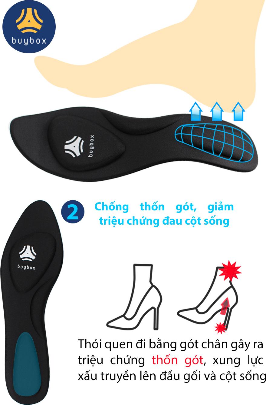 BÀN CHÂN CỦA BẠN ĐÃ ĐƯỢC BẢO VỆ ĐÚNG CÁCH CHƯA? !? Lót giày của bạn đang làm da bàn chân bị phồng rộp khi đi đứng trong thời gian lâu !? !? Lót giày lâu ngày bị xẹp lún làm cho bàn chân bị lực từ đế thô cứng tác động gây đau thốn gót chân !? !? Cấu tạo gang bàn chân nhiều phần lõm nên ngày nào cũng cảm thấy mỏi bàn chân !? !? Lót giày không thấm hút mồ hôi và giày da bí hơi khiến bàn chân luôn ướt và có mùi khó chịu !? !? Thói quen bước đi bằng gót chân gây ra các cơn đau thốn gót, đau lưng và mỏi đầu gối !? ĐÃ ĐẾN LÚC KIỂM TRA LẠI TÌNH TRẠNG MIẾNG LÓT GIÀY BẠN ĐANG MANG VÀ NGHĨ ĐẾN NHỮNG NỖI ĐAU CỦA ĐÔI BÀN CHÂN!!! SỬ DỤNG LÓT GIÀY CAO GÓT MŨI NHỌN 4D CÓ GỜ CHỐNG SỐC CỦA buybox SẼ BẢO VỆ ĐƯỢC BÀN CHÂN VÀ CẢ SỨC KHỎE CỦA BẠN!!!   CÔNG DỤNG NỔI BẬT Thiết kế 4D bảo vệ 3 điểm quan trọng của bàn chân, gồm: gót chân, gang bàn chân và lòng bàn chân phía trước mũi. Chống thốn gót chân Chống mỏi gang bàn chân Chống rộp da chân do ma sát với miếng lót chất liệu cứng và không hút mồ hôi Thấm hút mồ hôi chân giúp ngăn mùi hiệu quả Sản phẩm có thể giặt sạch bằng xà phòng nhẹ và tái sử dụng nhiều lần Giày đi lâu ngày, phần lót giày bị lún, lót vào đi êm chân hơn, thoải mái Mặt dưới miếng lót được kẻ sẵn size tương ứng. Dùng kéo cắt theo các đường cong này để có được kích thước cần sử dụng. Lót giày cao gót mũi nhọn 4D có gờ chống sốc sử dụng được cho nhiều loại giày có phần mũi nhọn như: giày sneaker, giày tây, giày mọi, giày boot, giày búp bê, giày cao gó NGỮ CẢNH SỬ DỤNG