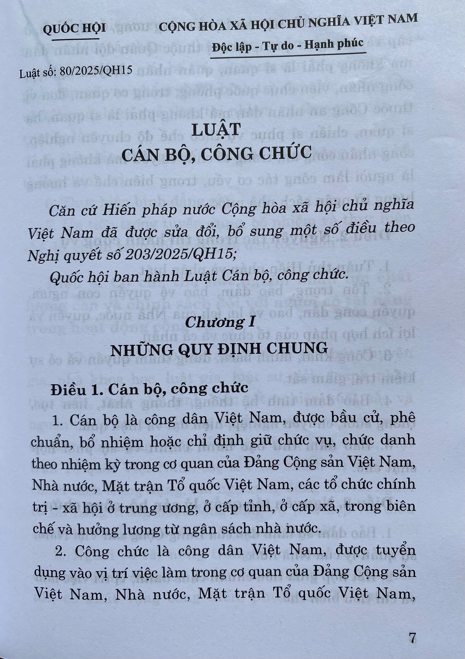 Luật Cán Bộ, Công Chức số 80/2025/QH15 đã được Quốc Hội khoá XV, kỳ họp thứ 9 thông qua ngày 24-06-2025 . Luật gồm có 7 Chương, 45 Điều. Luật có hiệu lực áp dụng từ ngày 01-07-2025.