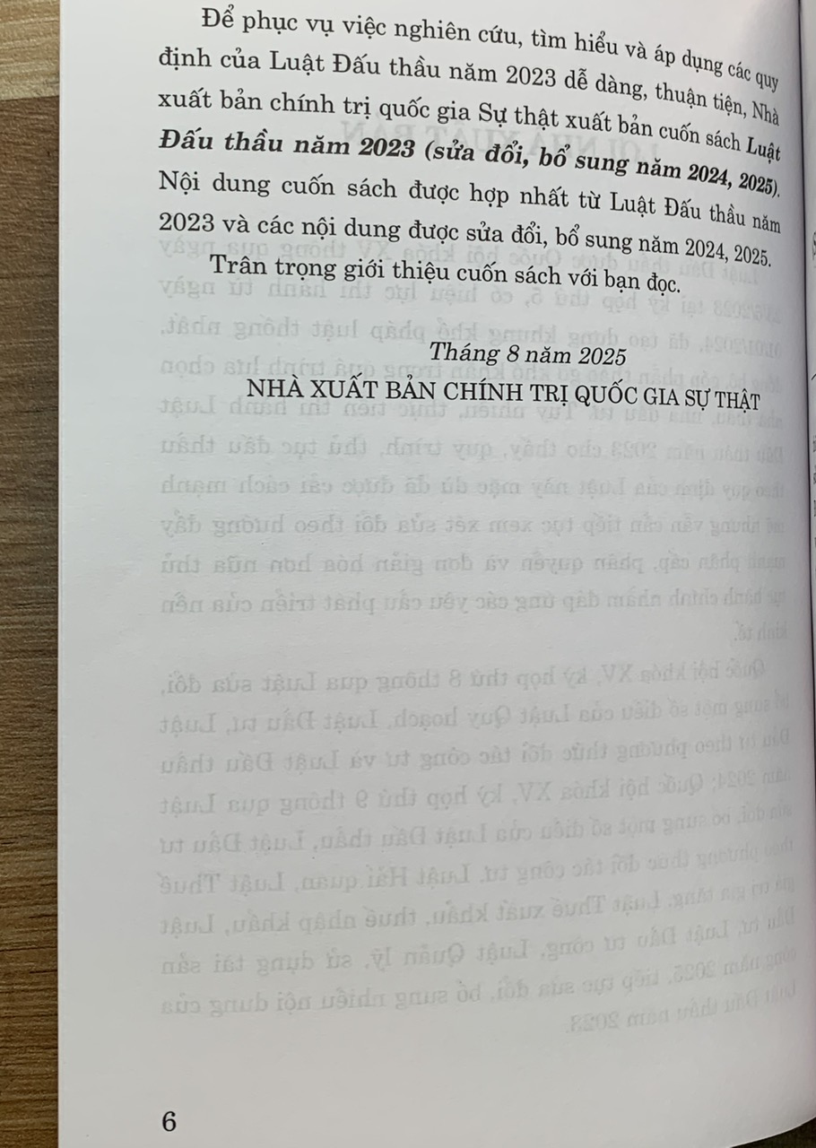 Sách Luật Đấu Thầu năm 2023 (Sửa đổi, bổ sung năm 2024, 2025) Tác giả: Quốc Hội. Nhà xuất bản: Chính Trị Quốc Gia Sự Thật. Năm xuất bản: 8.2025 Công ty phát hành: Nhà